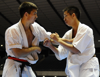 学生男子中量級で優勝したロシアのオトプコフ・エフゲニー(左)