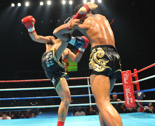 T-98(左)の右ハイキックがクリーンヒット!ブアカーオからTKO勝ちを奪った