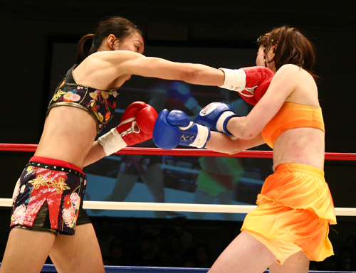 左右の蹴りと右ストレートで前へ前へと出て行く朱里(左)