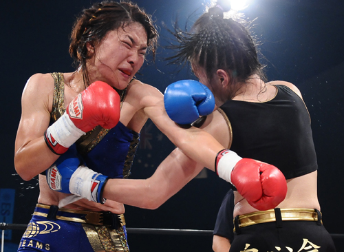 魅津希(右)の左ボディブローが高橋(左)のボディをえぐる!
