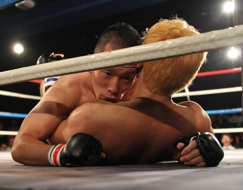 西岡攻児(上)がグラウンドでフォアマンを圧倒。3-0の判定勝利を収めた