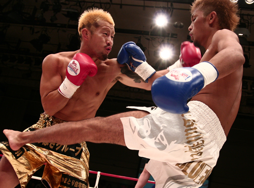 倒し倒されのダウン合戦を竹内(左)が制した