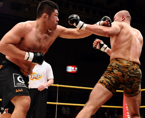 元キックボクサーの悠羽輝(右)を相手に、打撃で攻める中西良行(左)