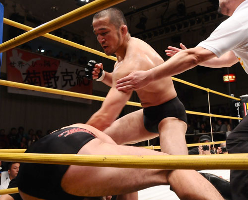 伊藤崇文(下)をTKOで下した中村大介(上)