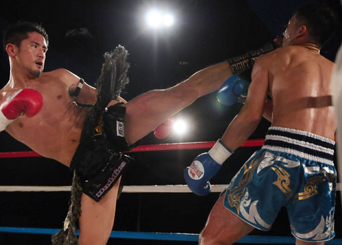 新鋭の後藤眞暢(右)から4度のダウンを奪って勝利した尾崎圭司(左)