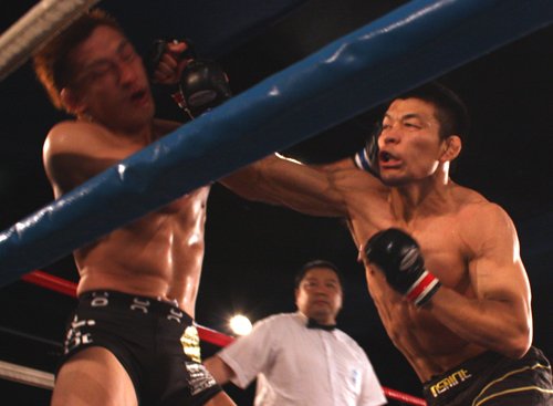 右ストレートで松本光史(左)からダウンを奪った小知和晋(右)