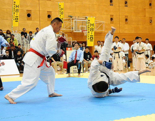“サバキ”を鮮やかに決めて対戦相手を崩して転倒させた水木(左)