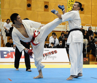 菅原がハイキックをヒットさせる