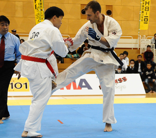 両者とも延長戦の連続で疲労していたが、クリストフ(右)が神戸(左)を打撃で場外へ押し出してポイントを重ねた