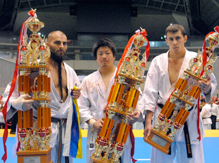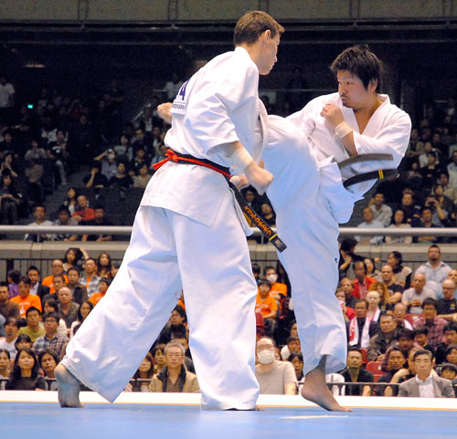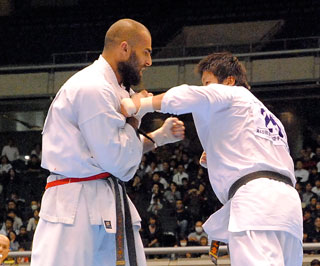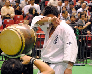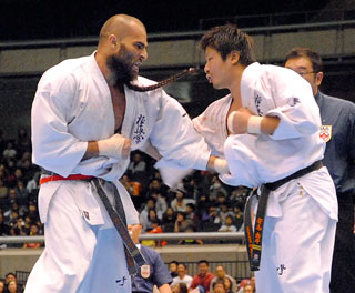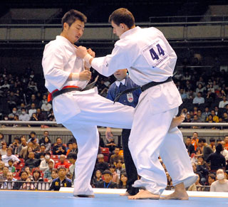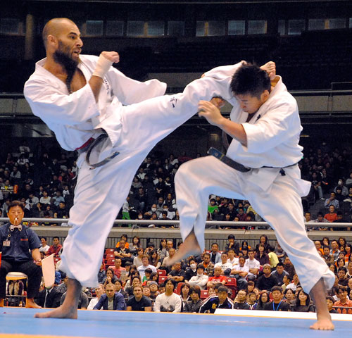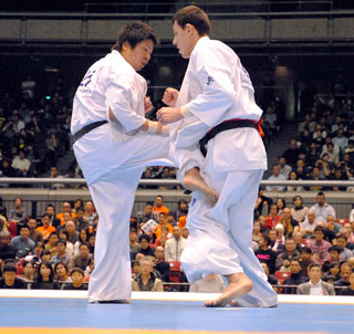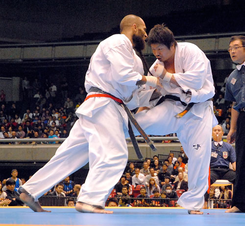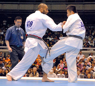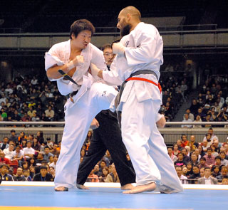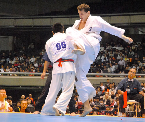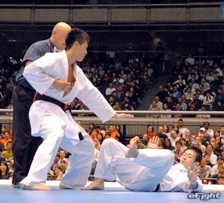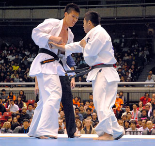 ▲高校生の上田(左)が森(右)から一本勝ちを奪う大金星