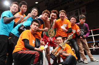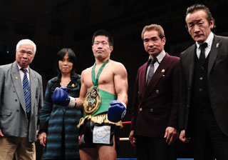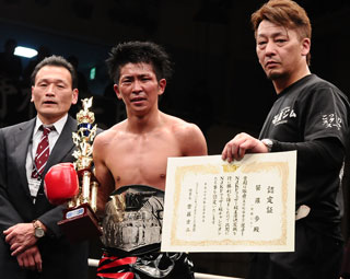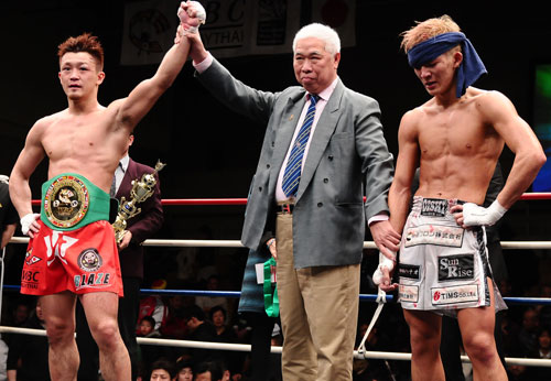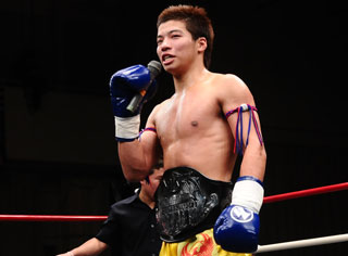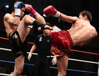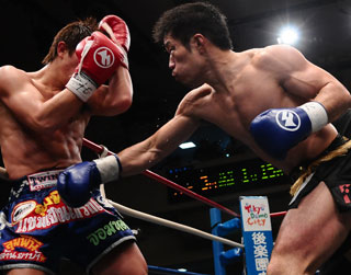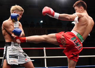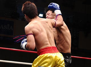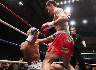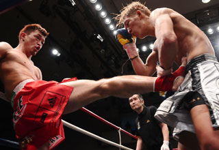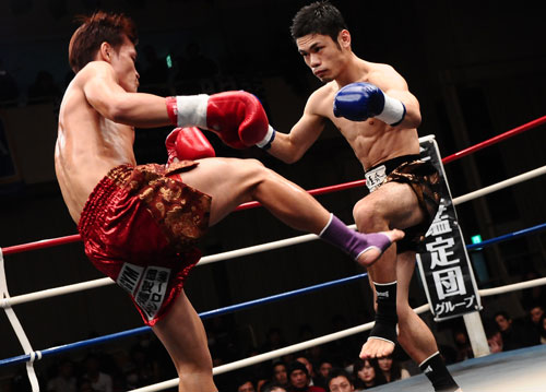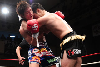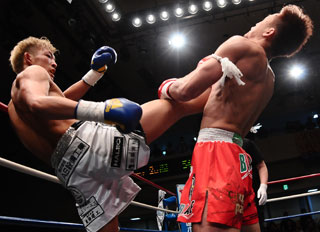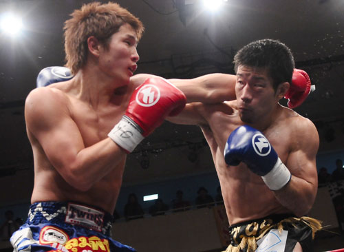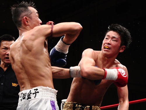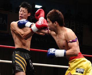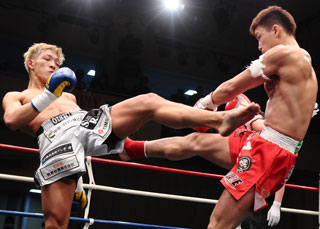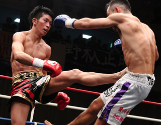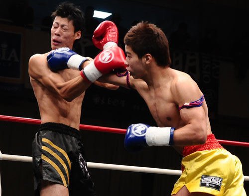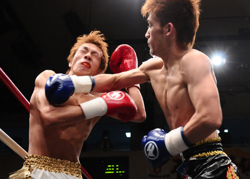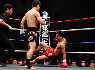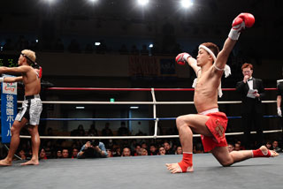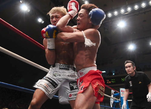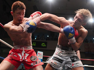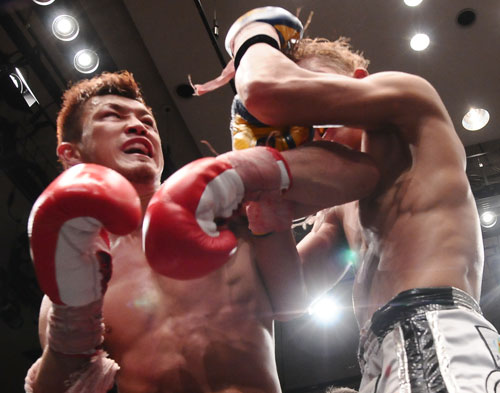 ▲2R、ヒジで野杁(左)からダウンを奪った大和(右)