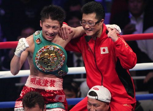 ▲父・真吾トレーナー(右)と勝利を喜ぶ井上尚弥(左)