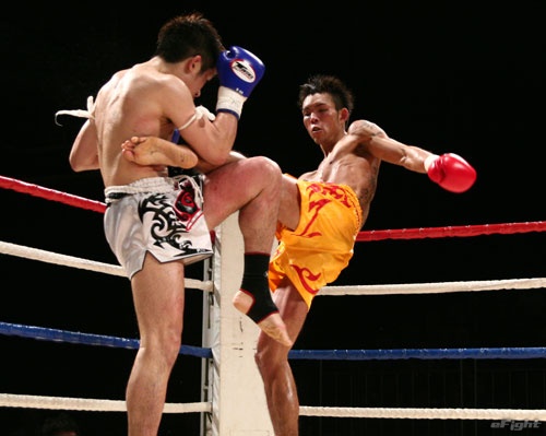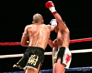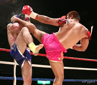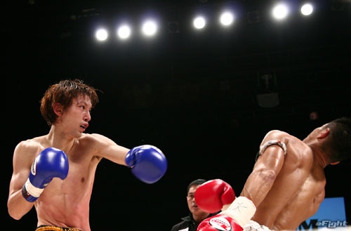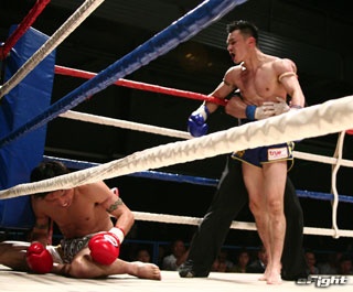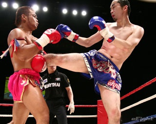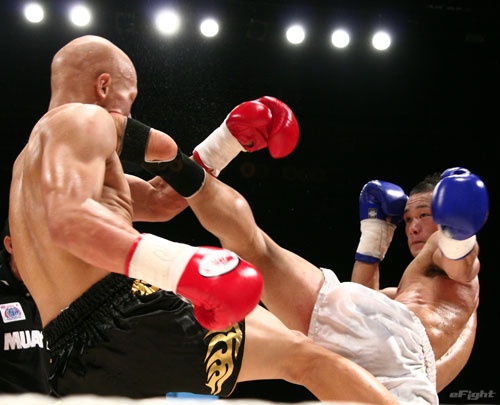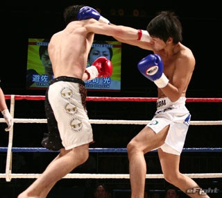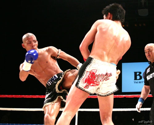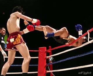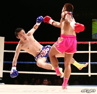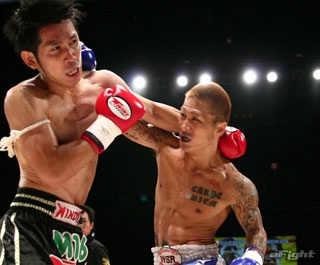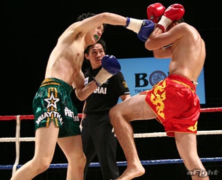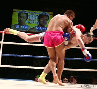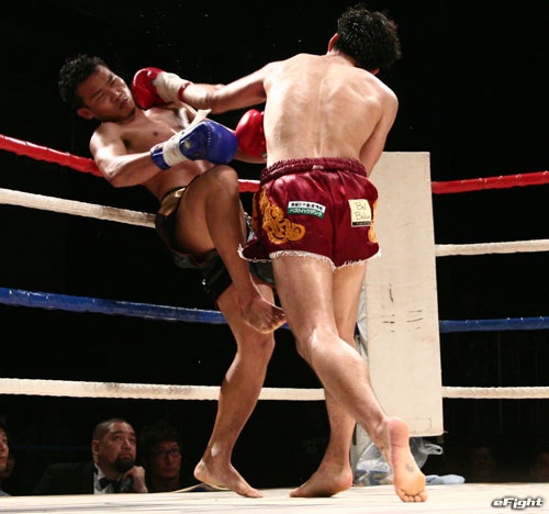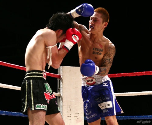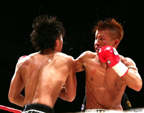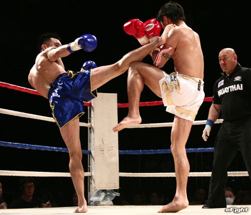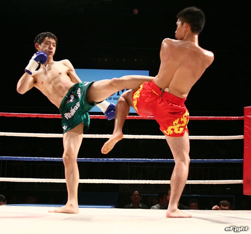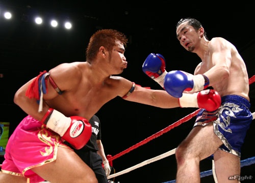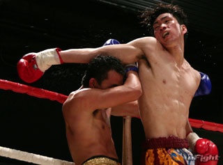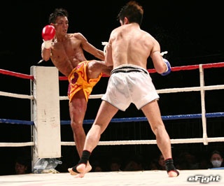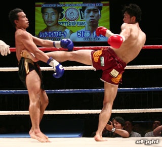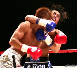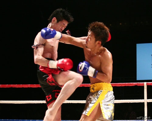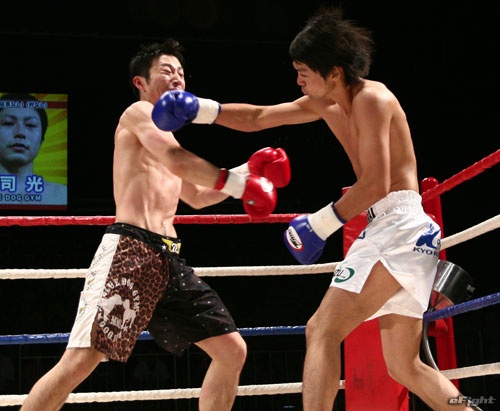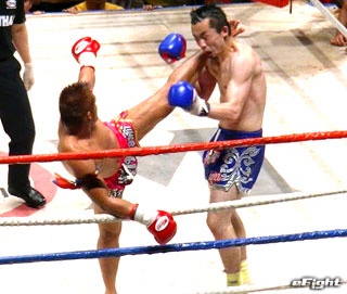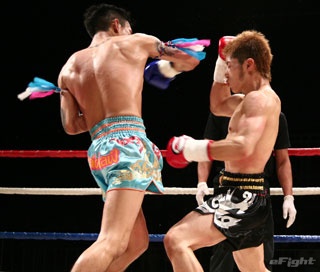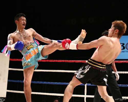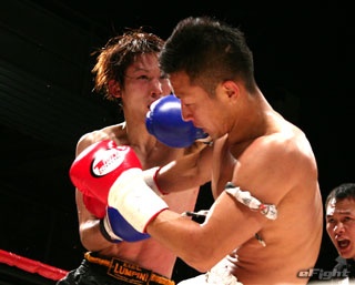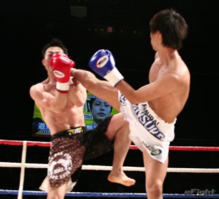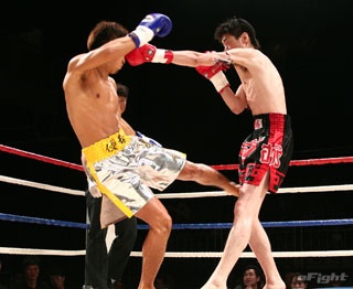 ▲両者とも蹴りを多用したが、藤野(左)がパンチ、ヒザも使って判定勝ち