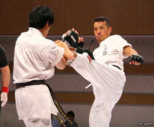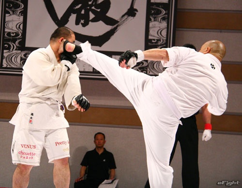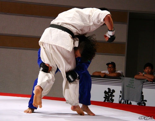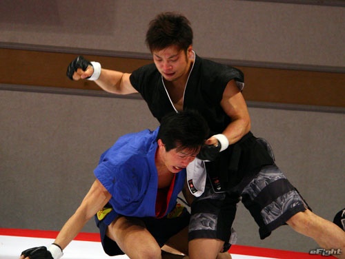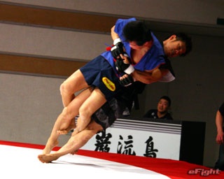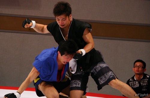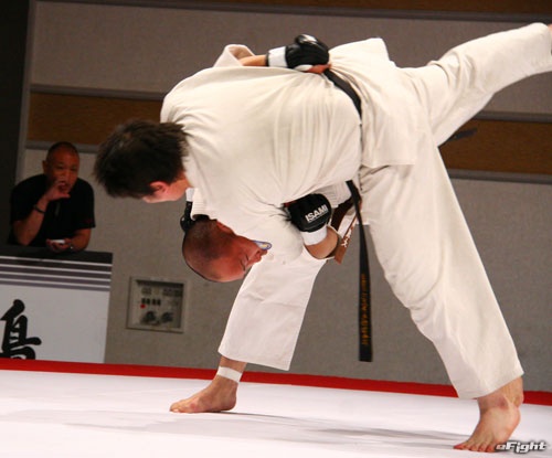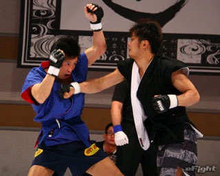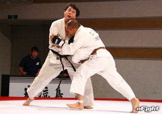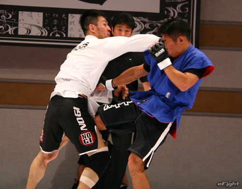 ▲TOSHI(右)は道着をつかんでパンチを打ち込む