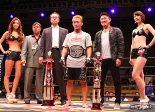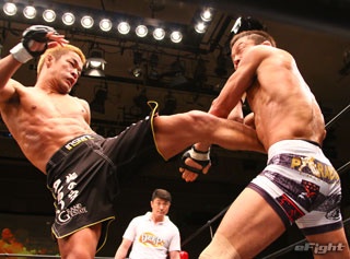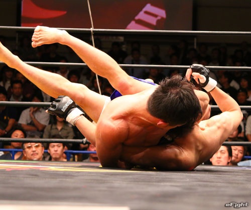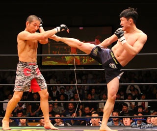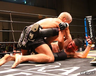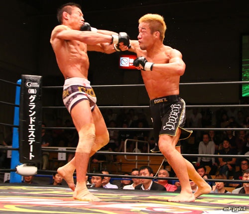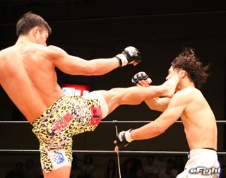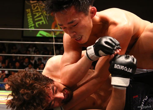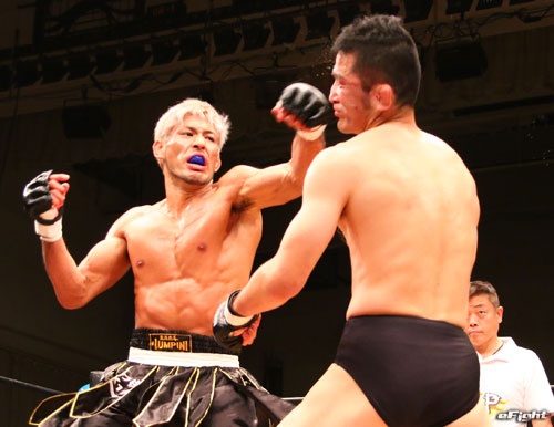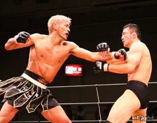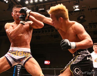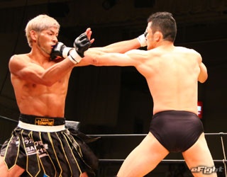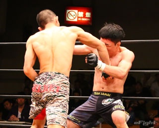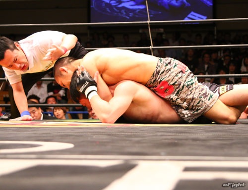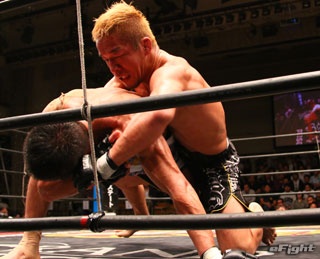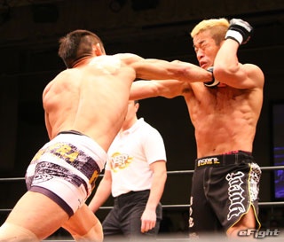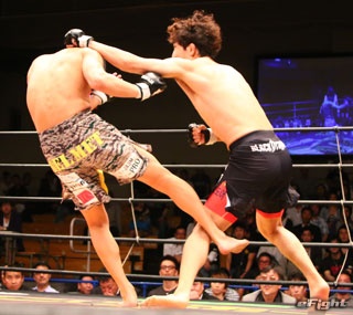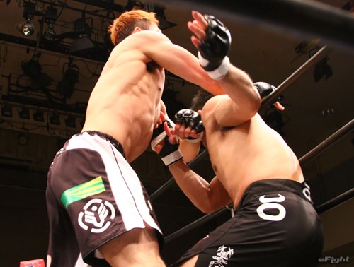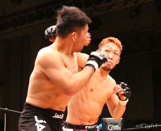 佐藤(左)が左ヒジで九十九(右)を流血に追い込み、デビュー以来の8連勝をマーク