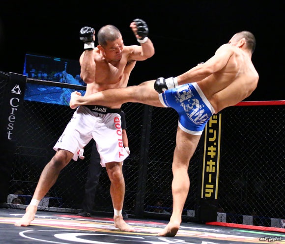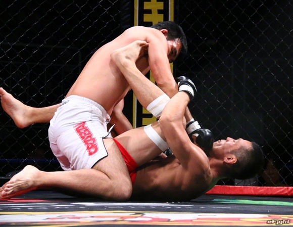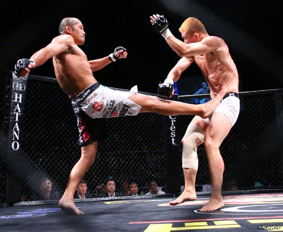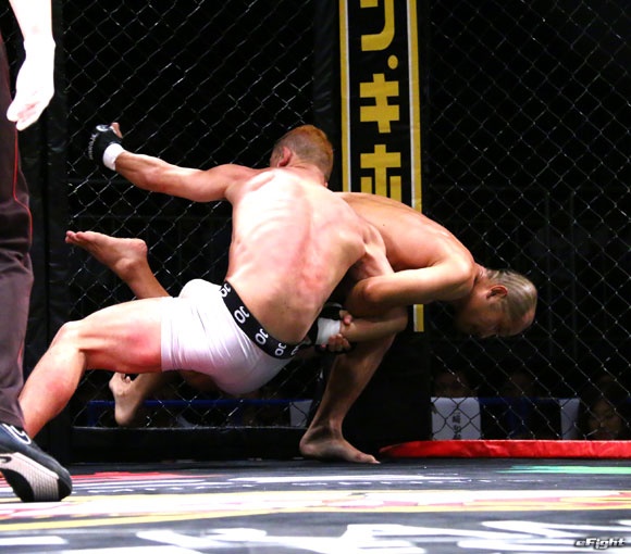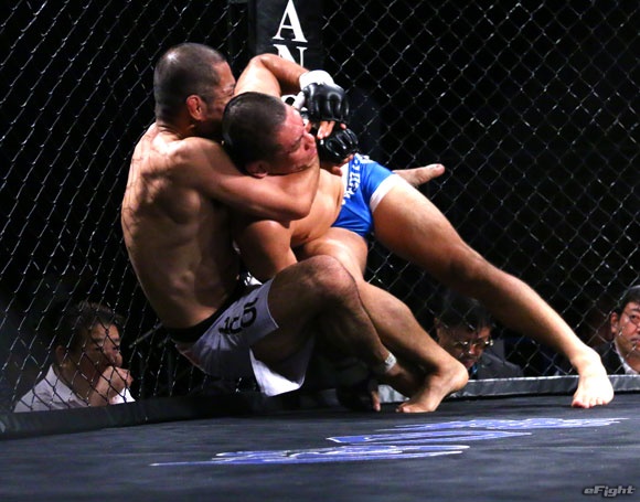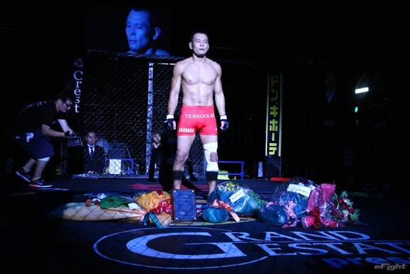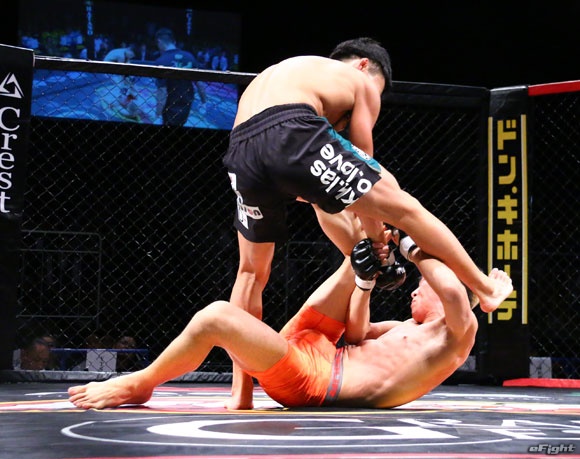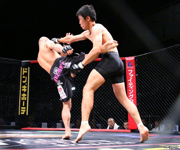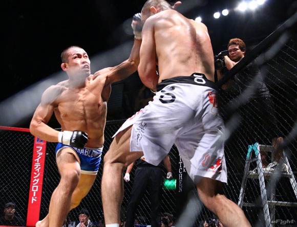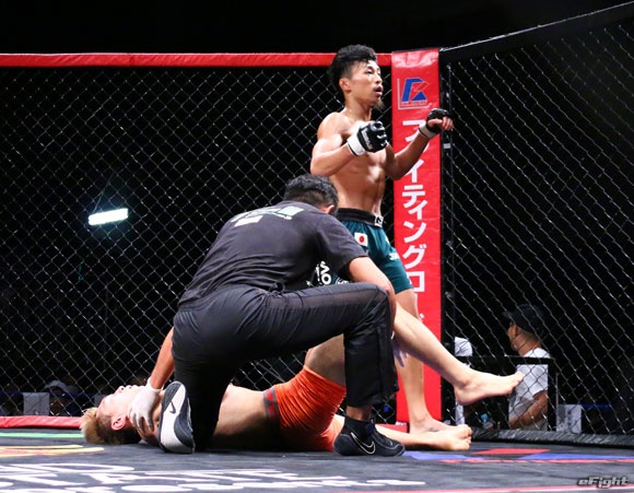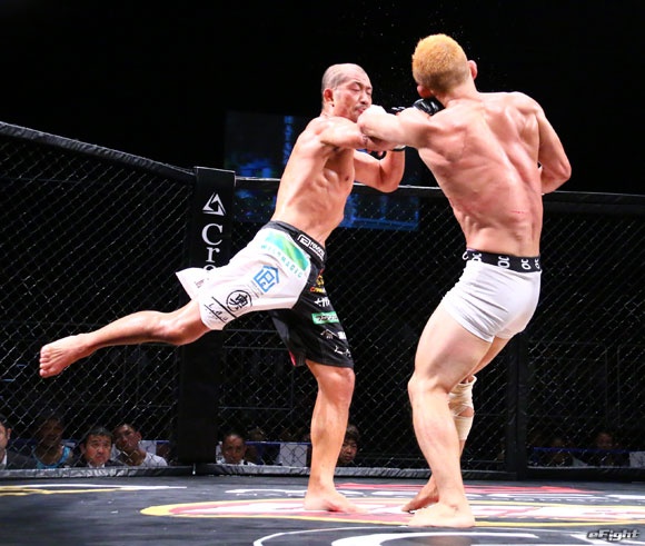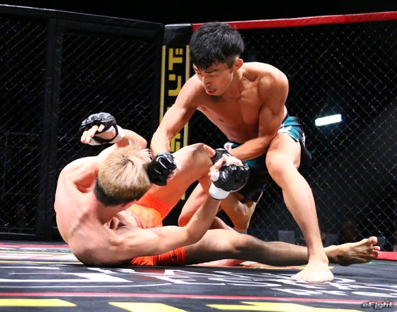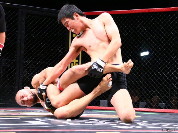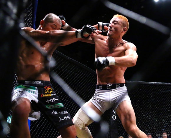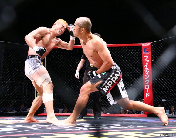佐々木(上)は全力ファイトで引退試合の小池(下)の相手を務めた