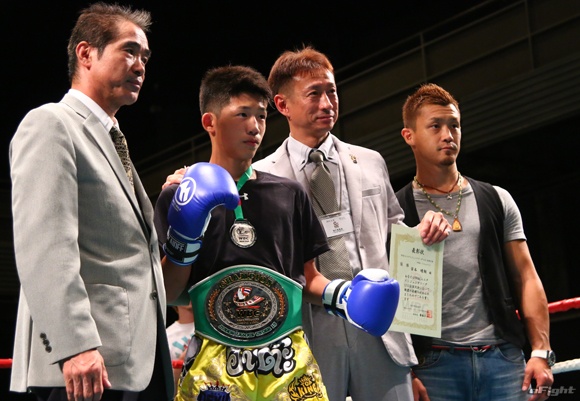 表彰のプレゼンターを務めたWBCムエタイ世界スーパーライト級王者・大和哲也(右端)