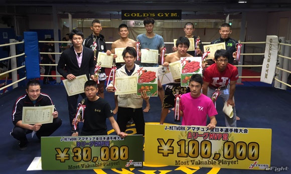 トーナメント優勝者たちとビギナーズMIP。前列右がAリーグMVPの大崎孔稀、前列左がBリーグMVPの磯貝太一