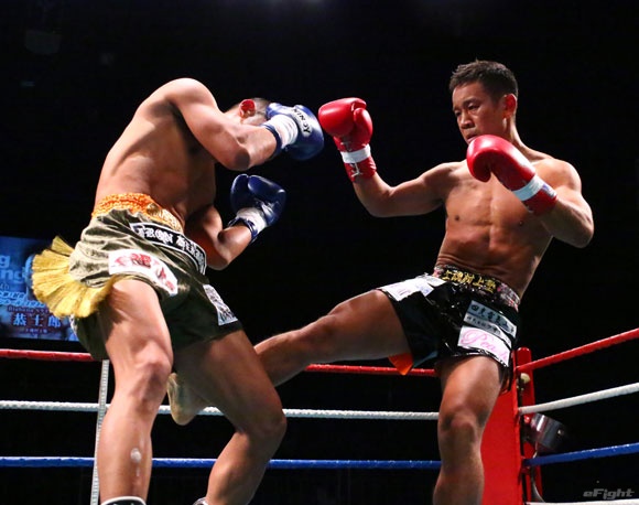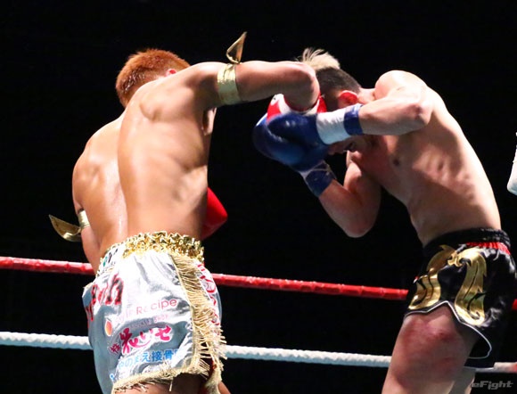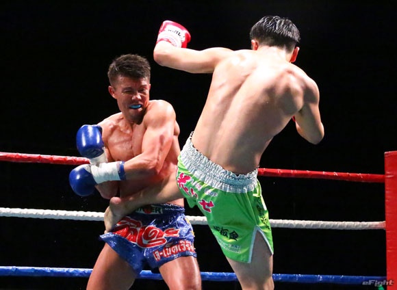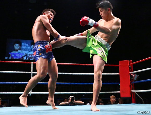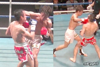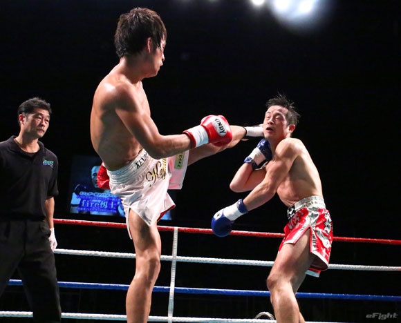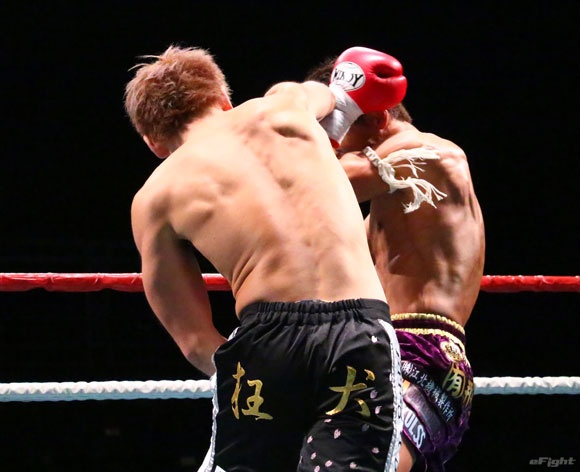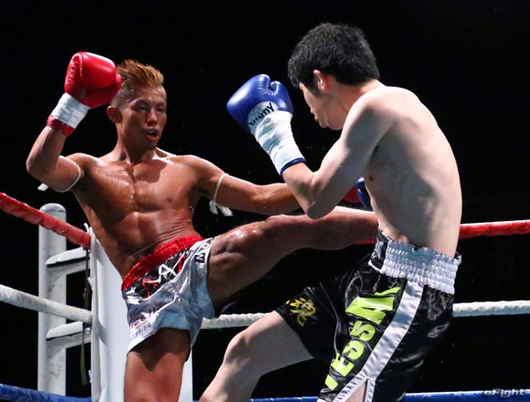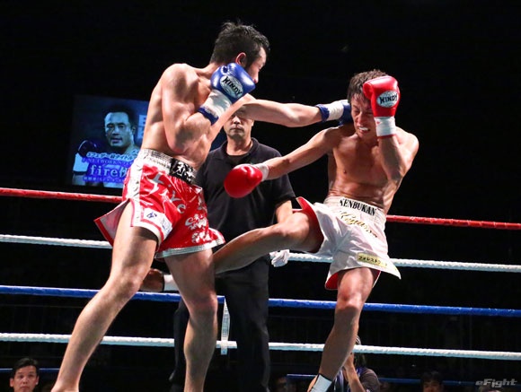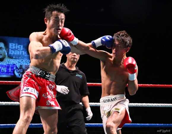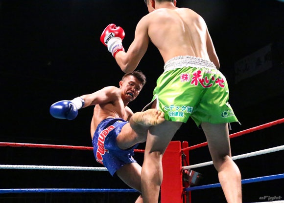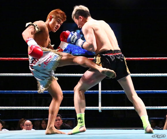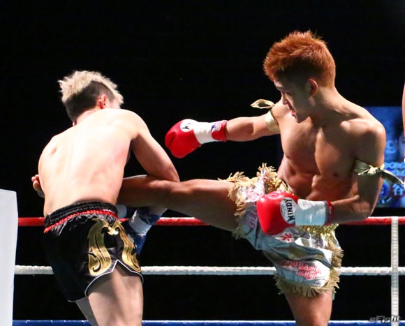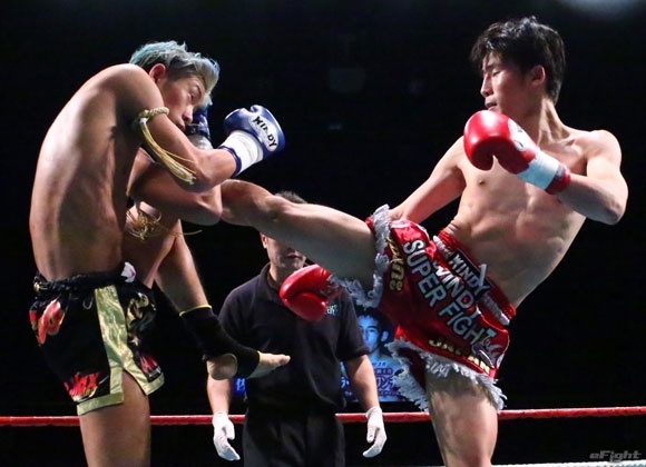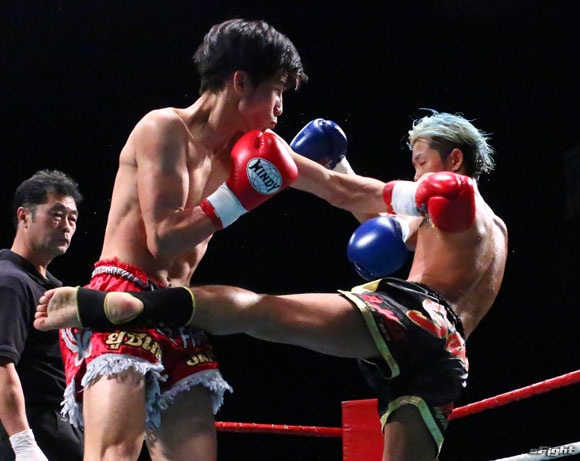 強い左ミドルを蹴り込んでいった祐(左)が勝利
