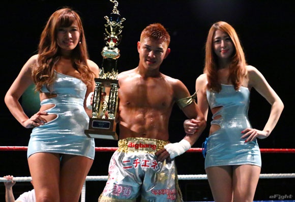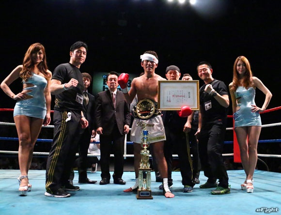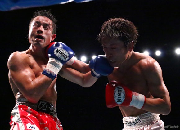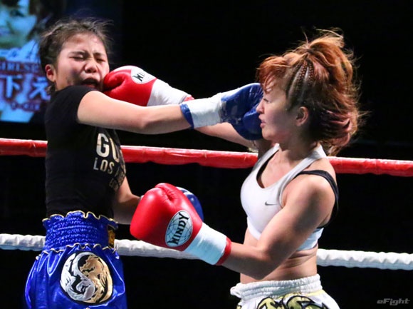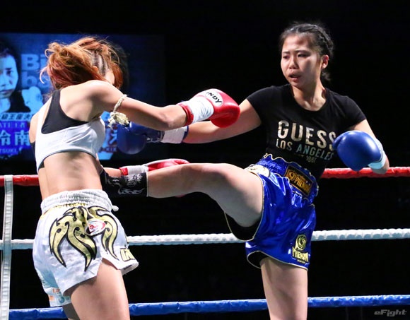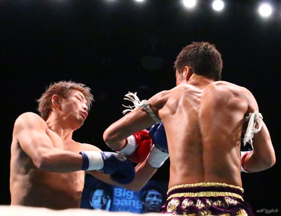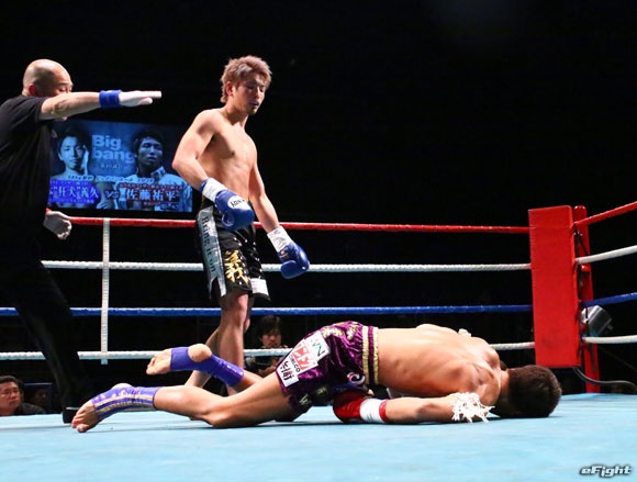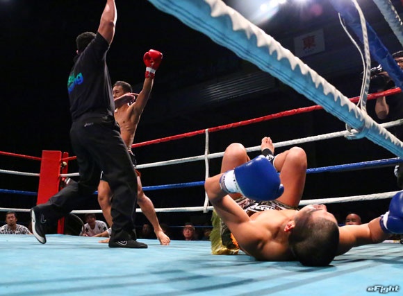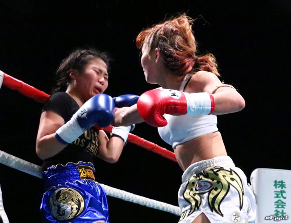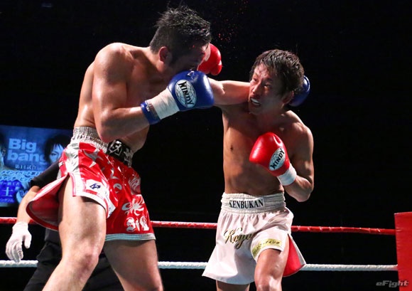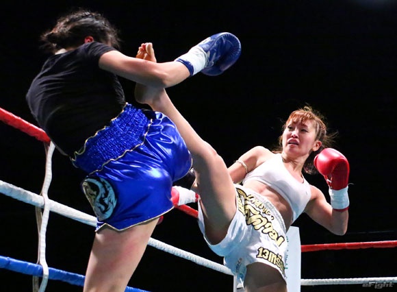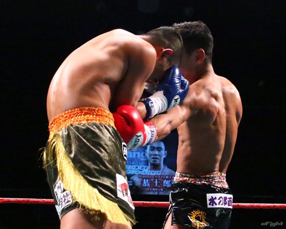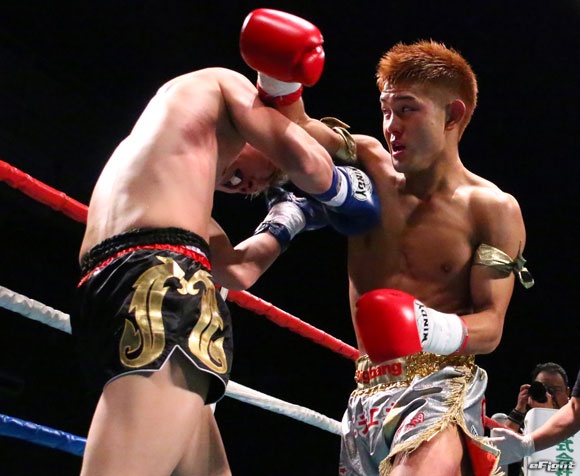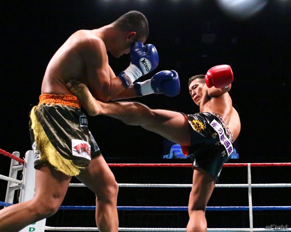強い左ミドルを蹴り込んでいった祐(左)が勝利