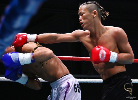 橋本(左)をコーナーに追い込んでパンチのラッシュを仕掛ける山口(右)