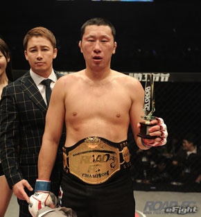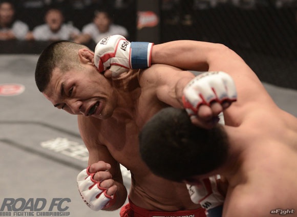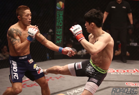 ジョンファン(右)の右フックを受け、福田(左)はマットに沈んだ