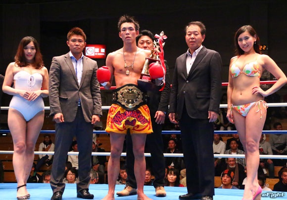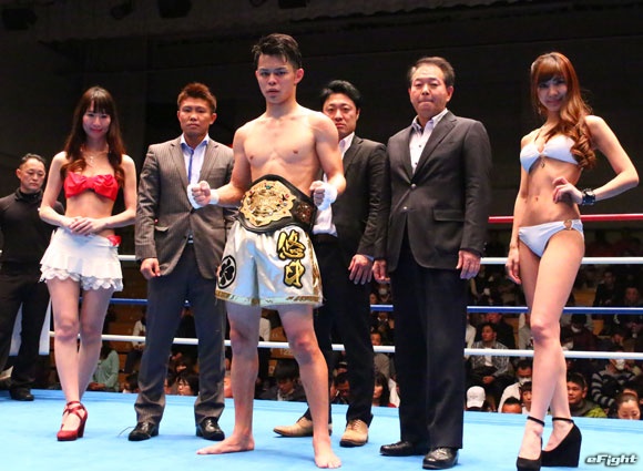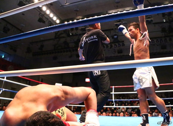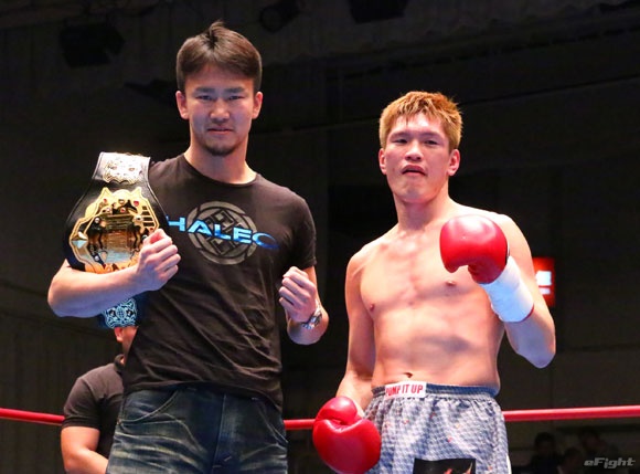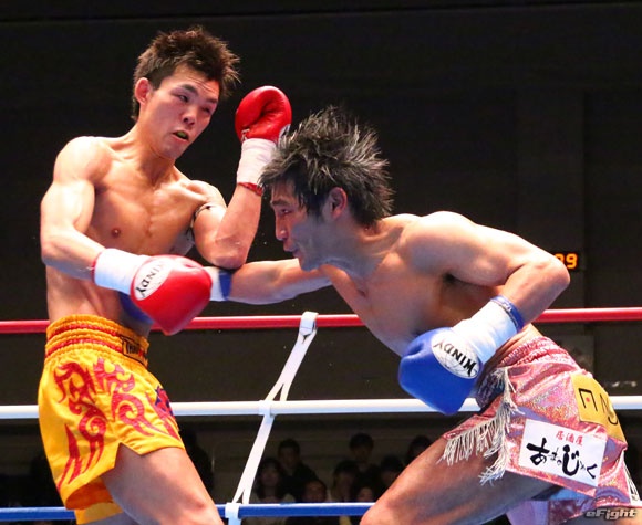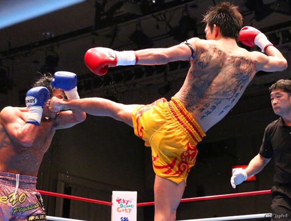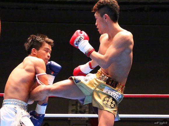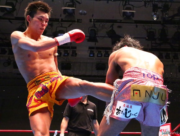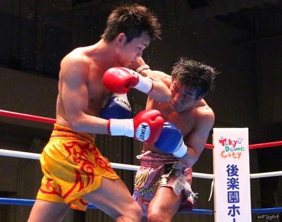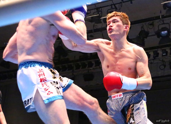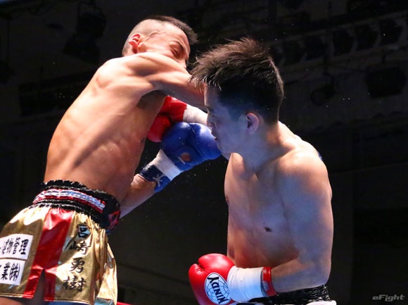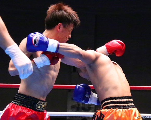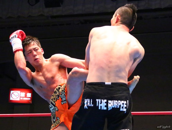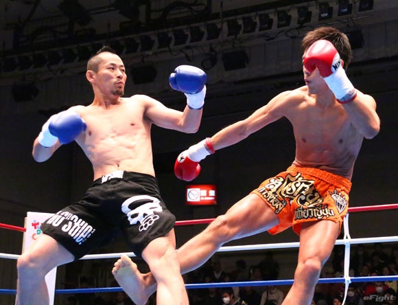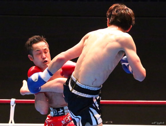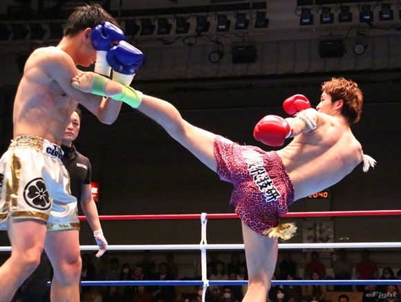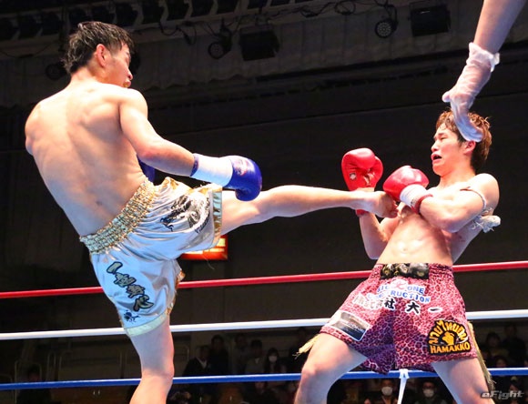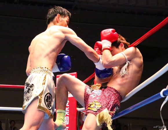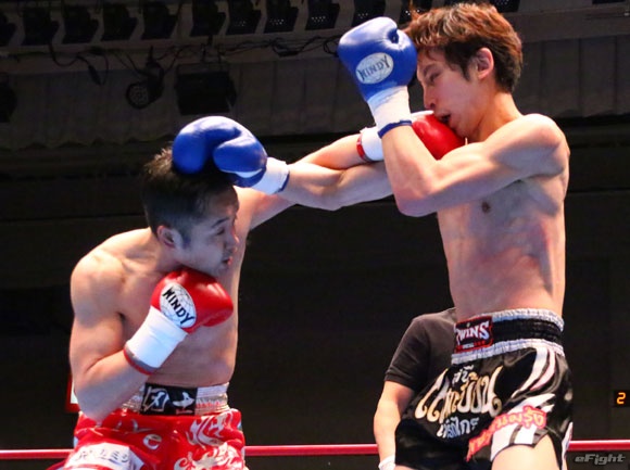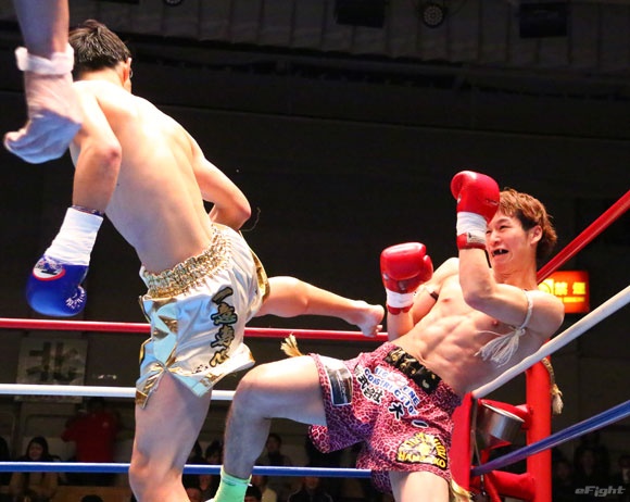 岩崎(左)のこの右ミドルキックで高橋(右)はダウン