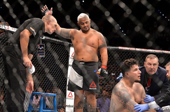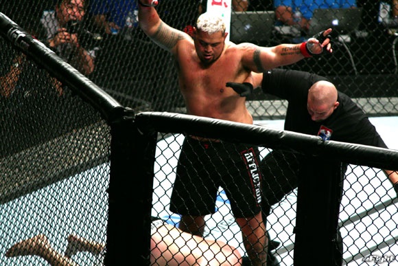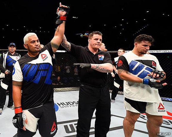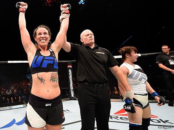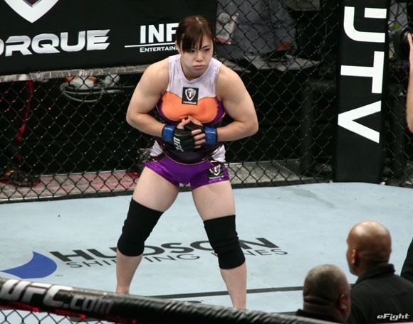 大歓声に応えて一撃でミア(左)にKO勝ちしたハント(右)