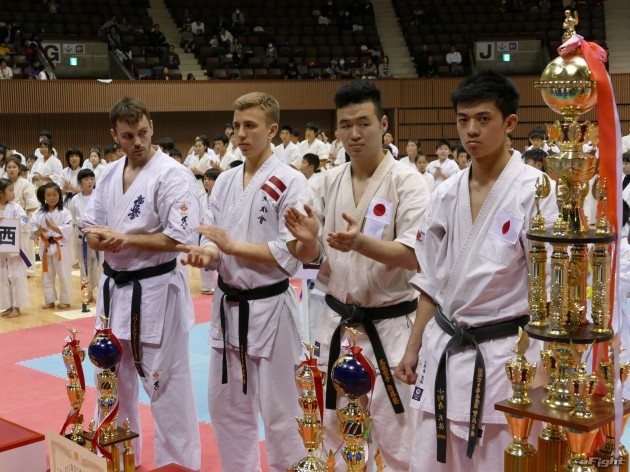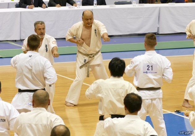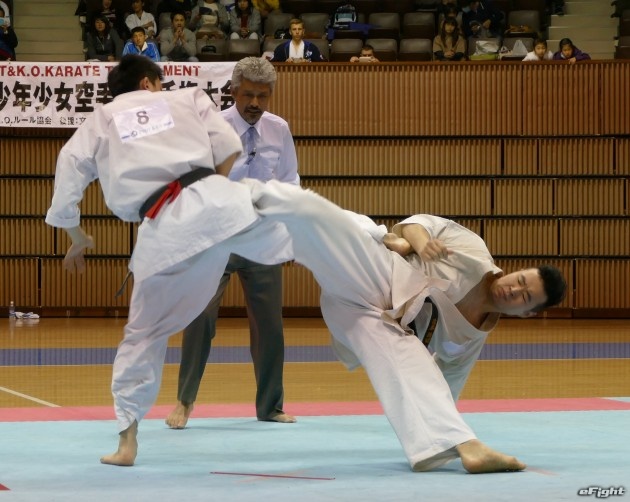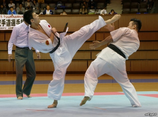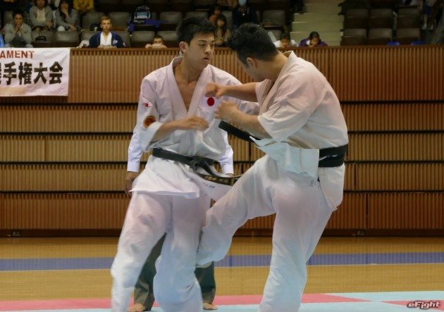 小野寺(左)の中段回し蹴りと、佐藤の後ろ回し蹴りが交錯する