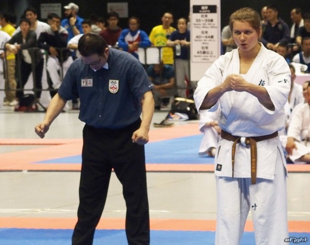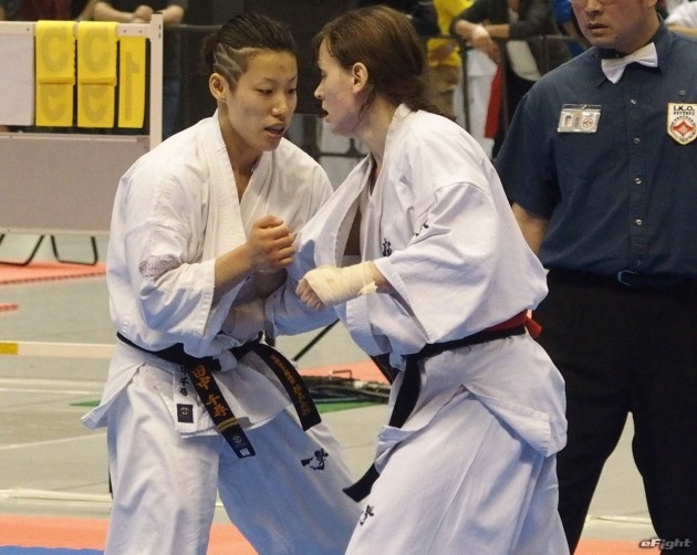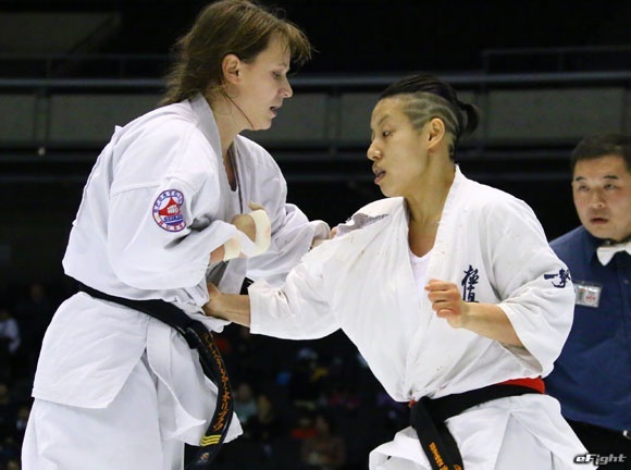 永吉はアナスタシアに延長戦で惜敗。3位決定戦では昨年世界中量級4位のロシアのイウリア(右)に残る力を搾り出したが判定で一歩及ばなかった。