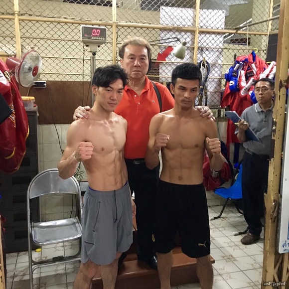 ラジャダムナンスタジアム興行に初出場した江幡塁(左)。写真は計量後のもの