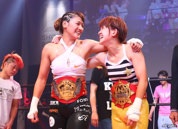 初防衛に成功したRENA(左)と48kg級アジアトーナメントを制したMIO(右)