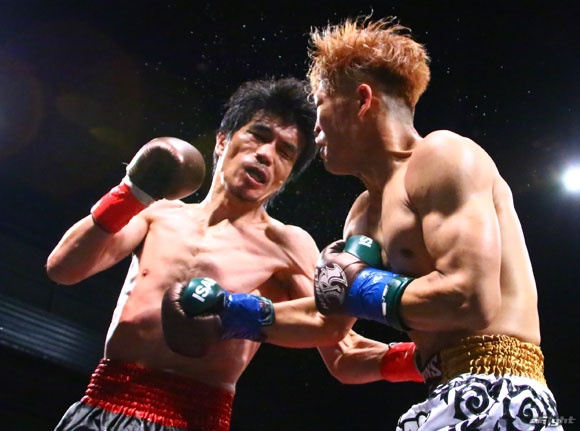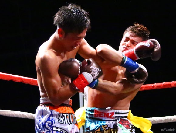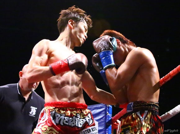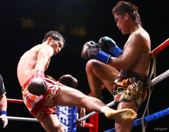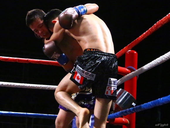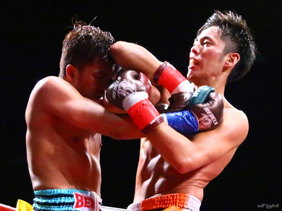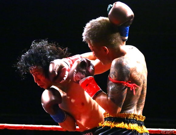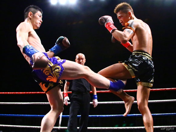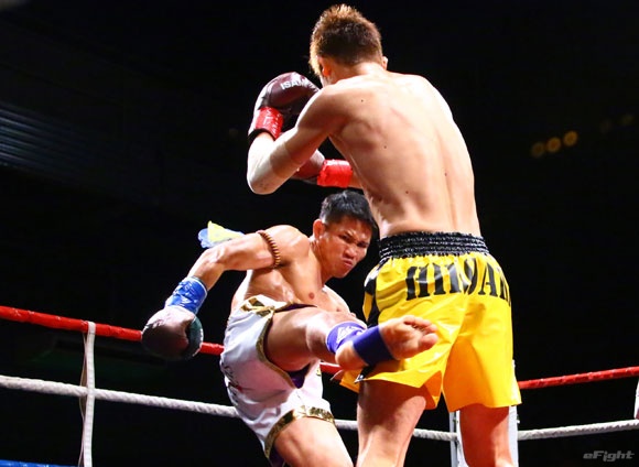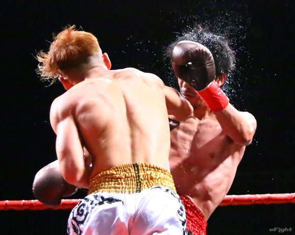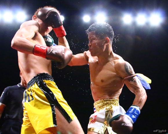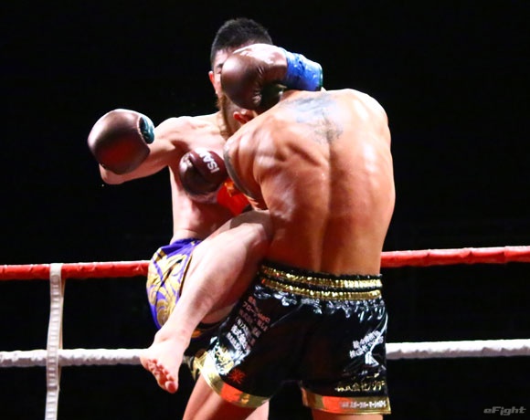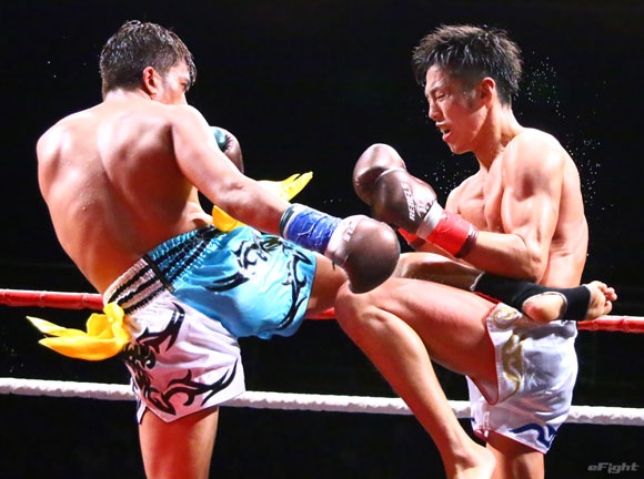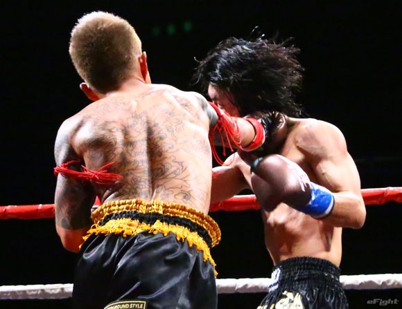 フルラウンド全く手を休めることなく攻め続ける“超攻撃型ムエタイ”スアレック(右)の重い右ミドル