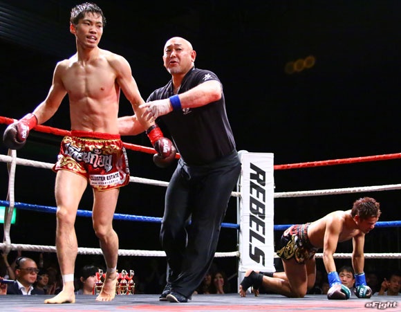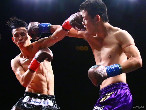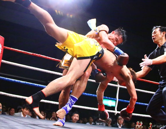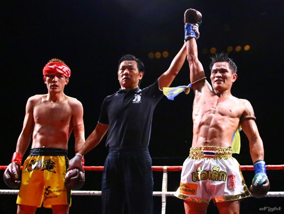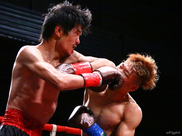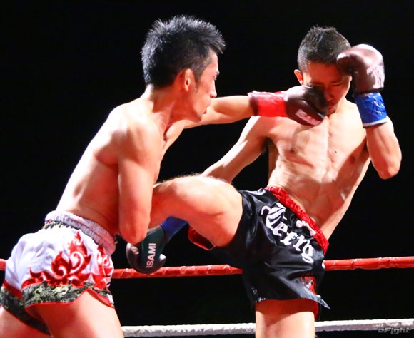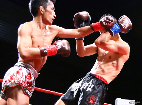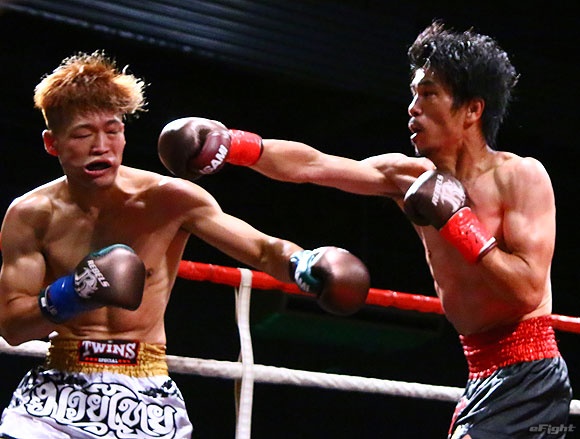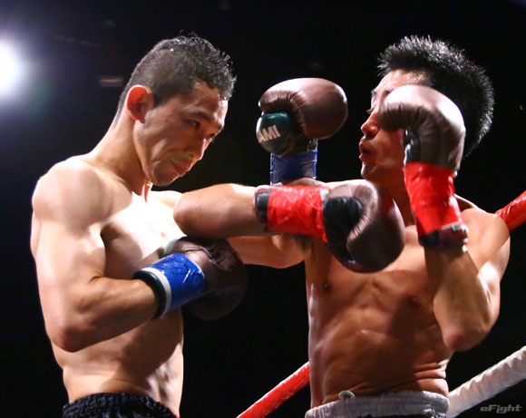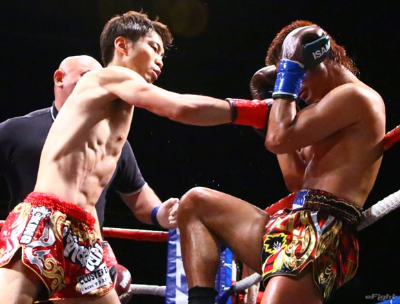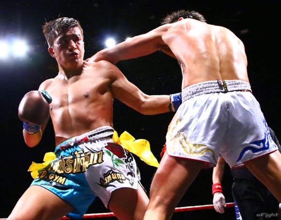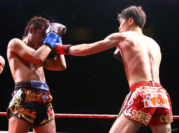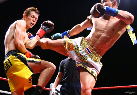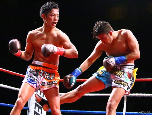 フルラウンド全く手を休めることなく攻め続ける“超攻撃型ムエタイ”スアレック(右)の重い右ミドル