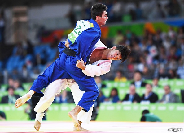 決勝戦はこの小内刈りで一本勝ちした大野(右)。今大会柔道初の金メダルを獲得した。写真=getty/eFight