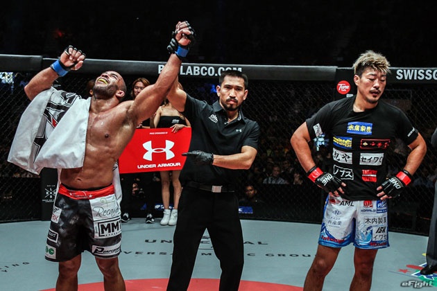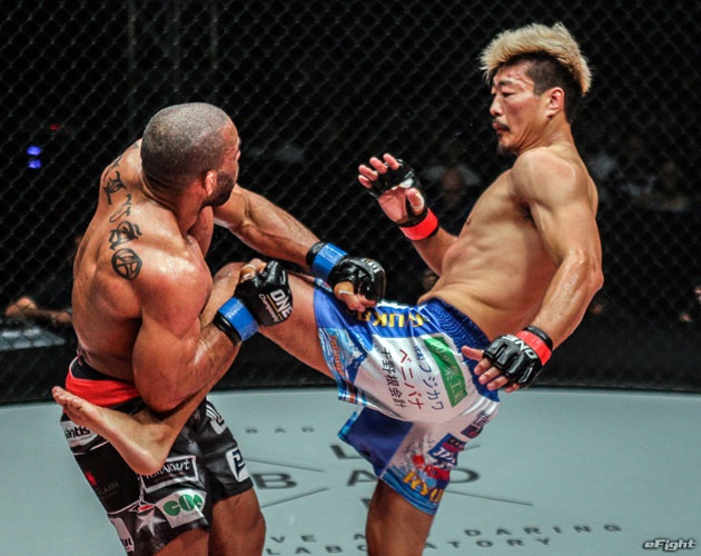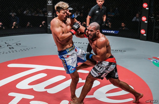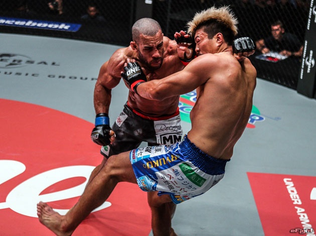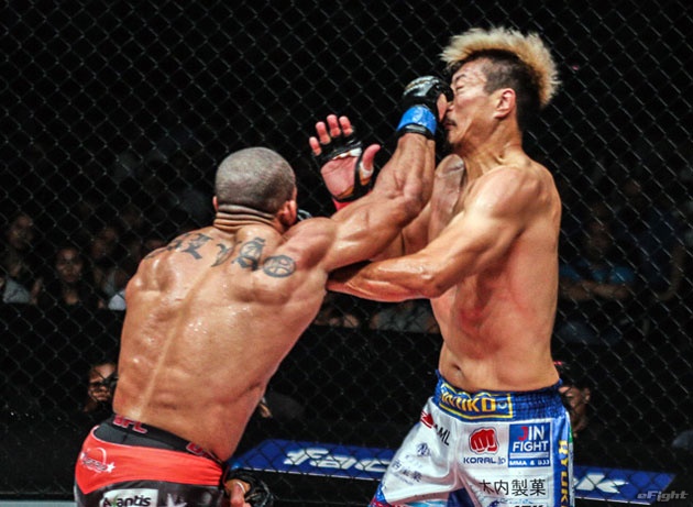 水野(左)のヒザ蹴りとガルバオ(右)のフックによる対決となったが、ガルバオが判定勝ち