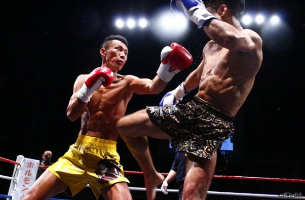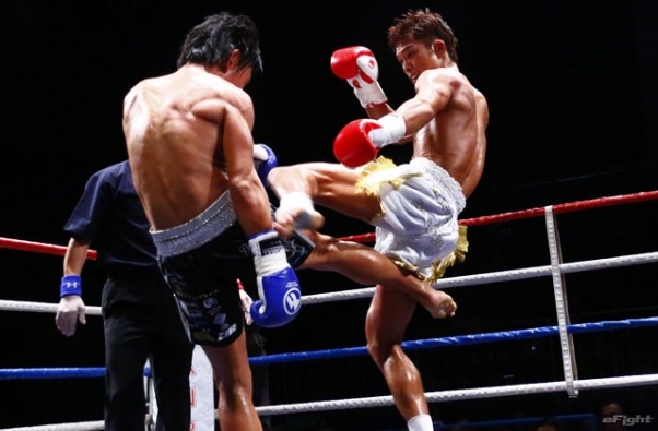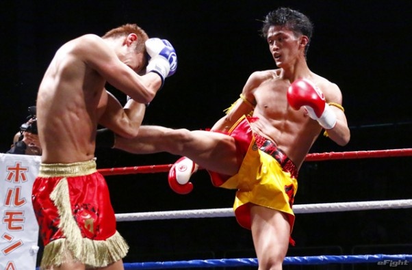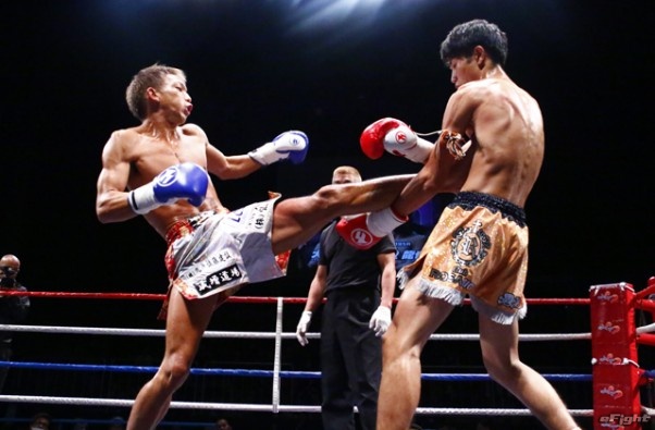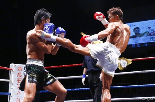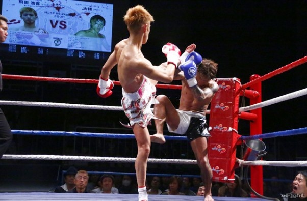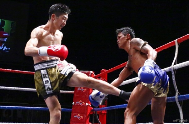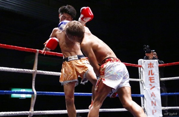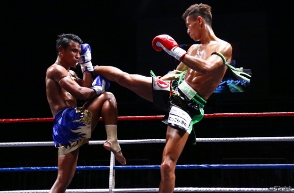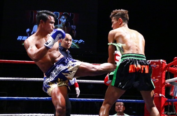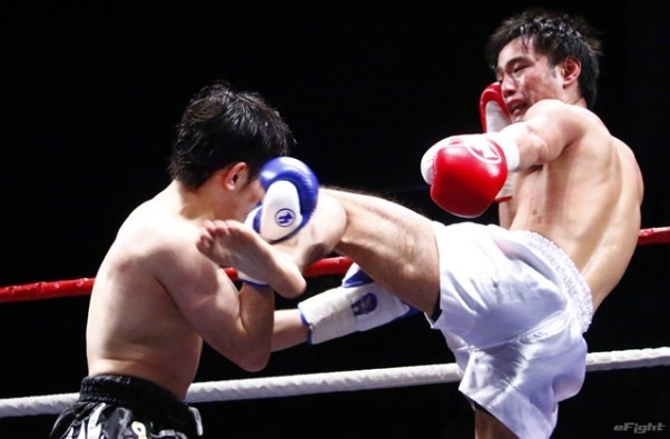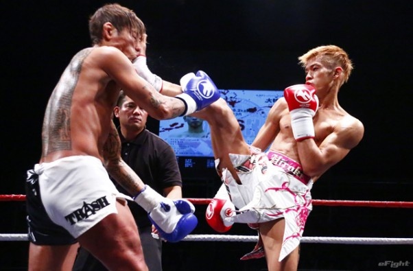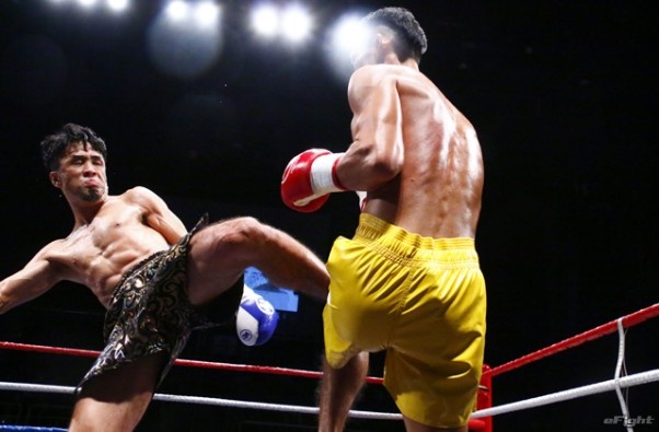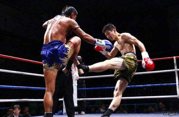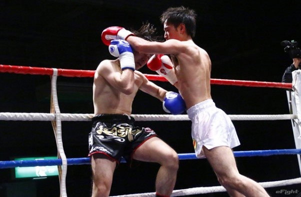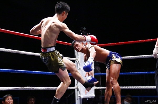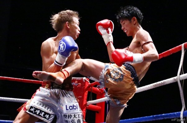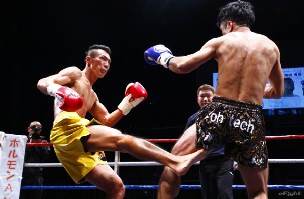前蹴りをヒットさせる前田(右)
