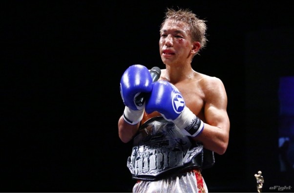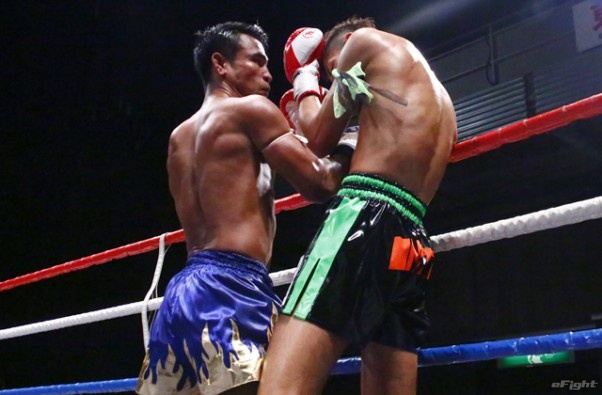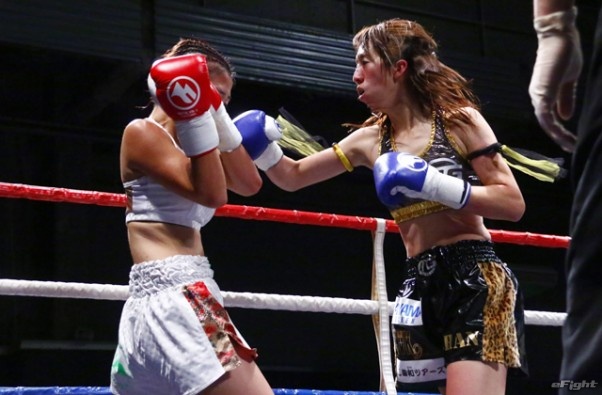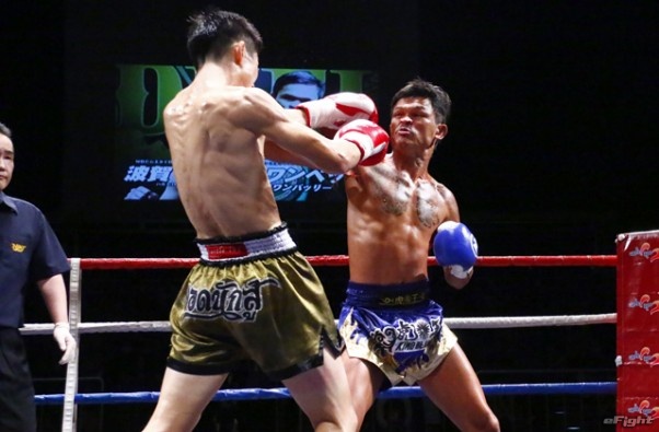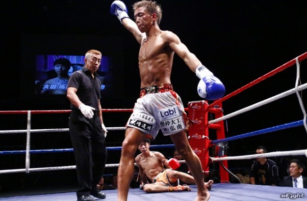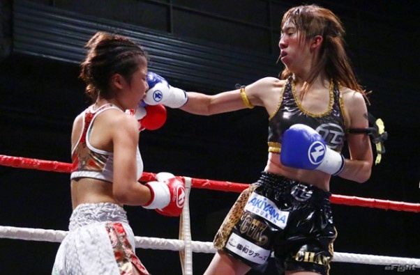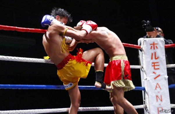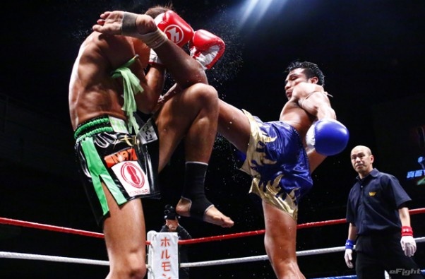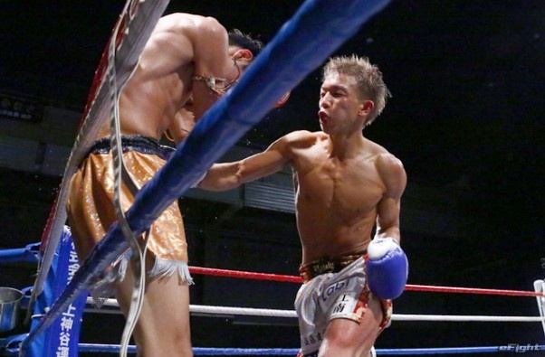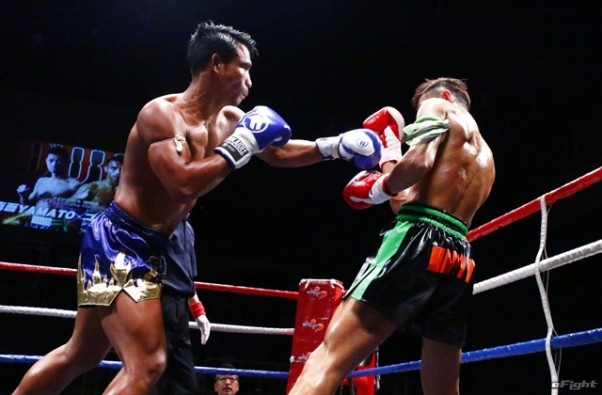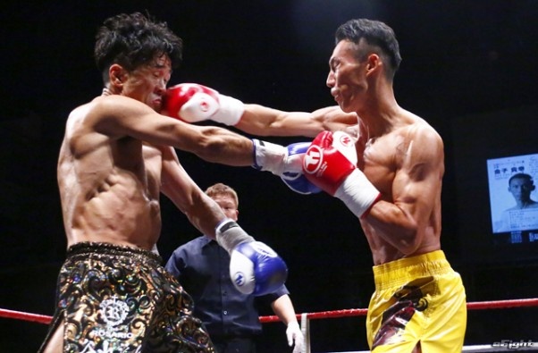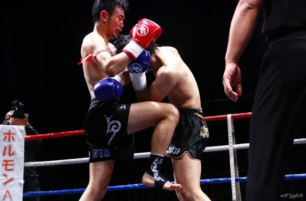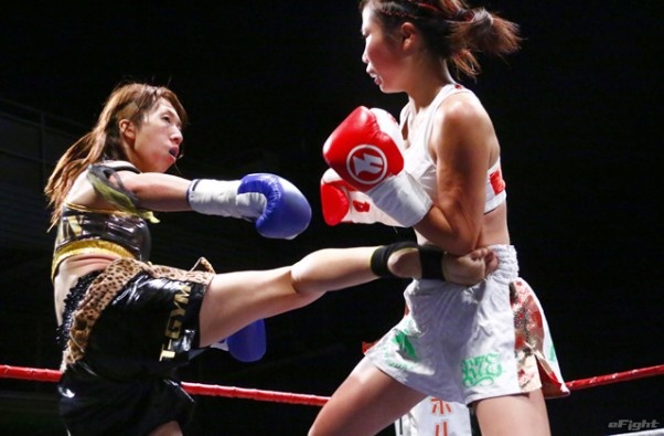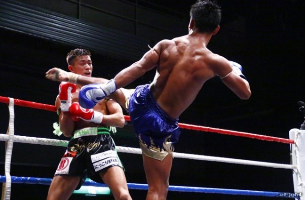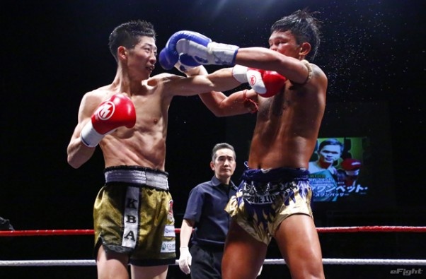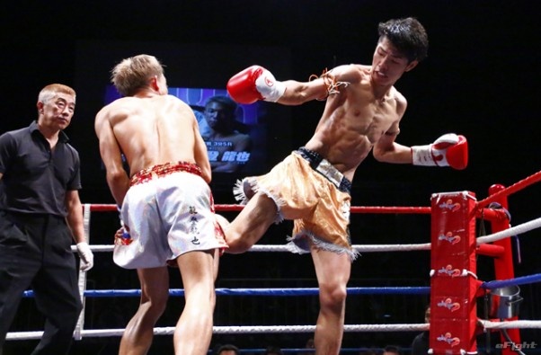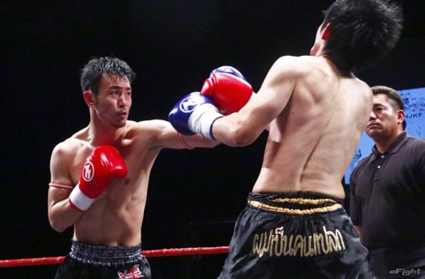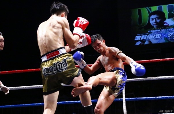 前蹴りをヒットさせる前田(右)