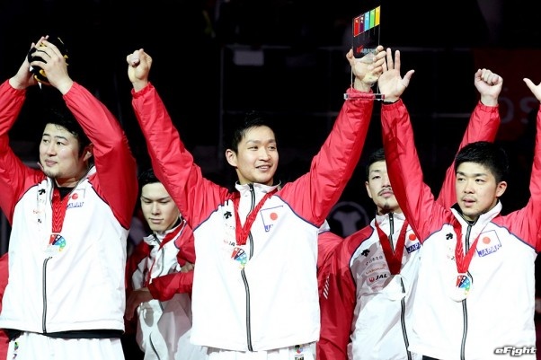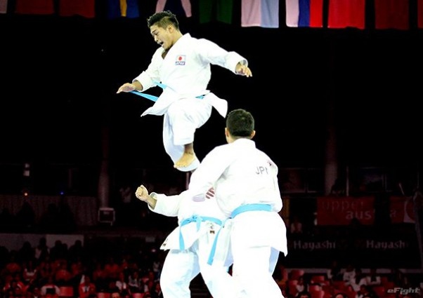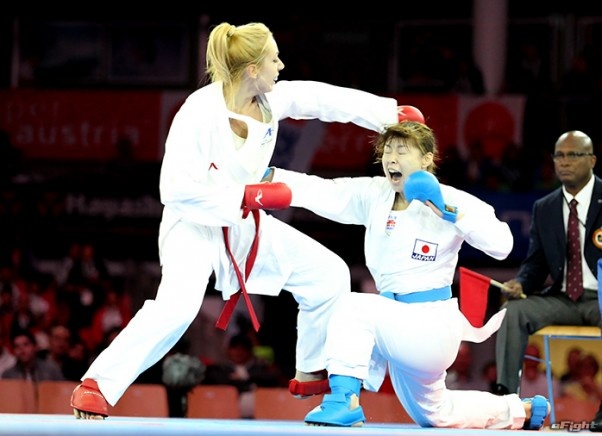 決勝戦で得意の中段突きを入れる植草歩(右)
