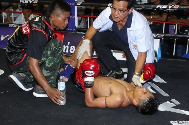 石井のローでマットに倒れたスーパーニューは苦痛の表情を浮かべた