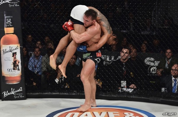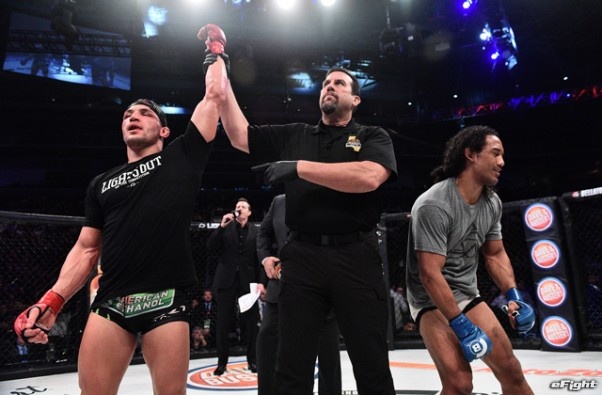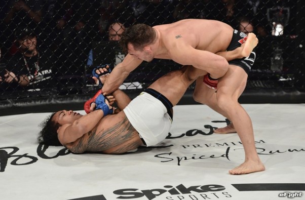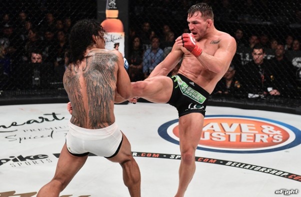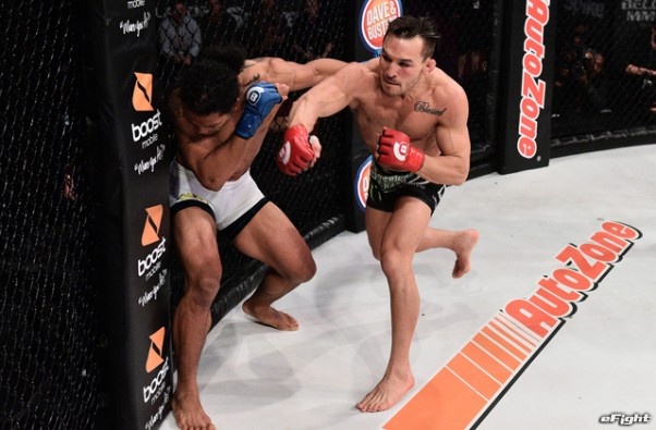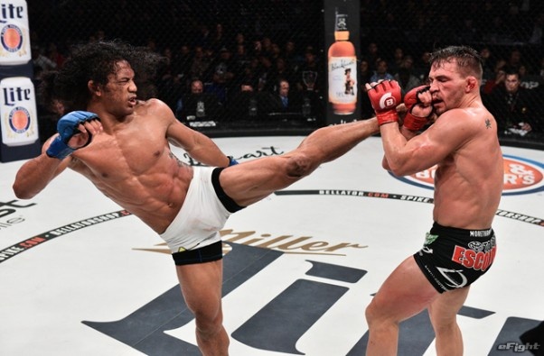 元UFC王者ヘンダーソン(左)にパンチで畳み掛けるBellator王者チャンドラー(右)