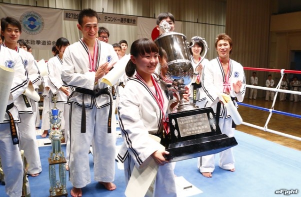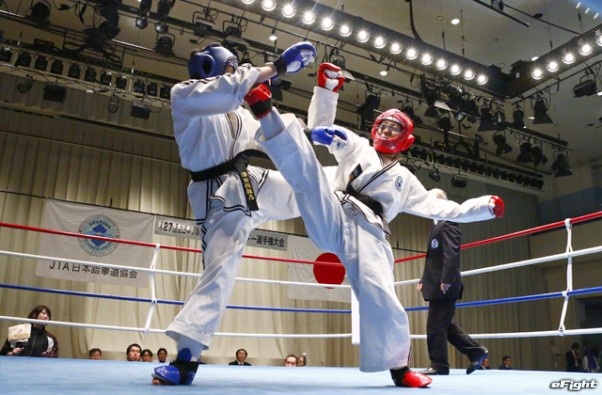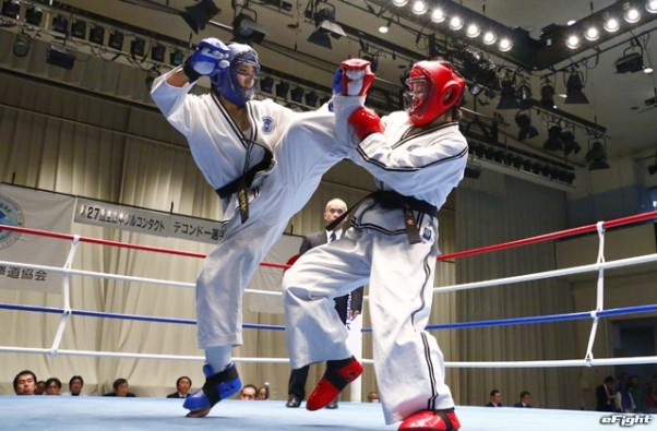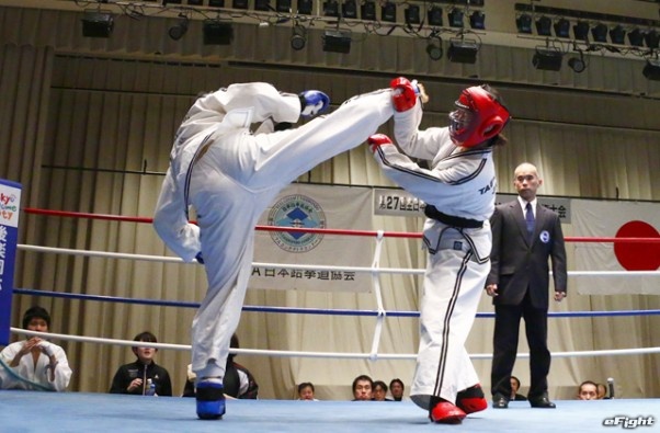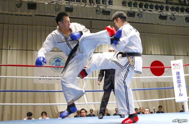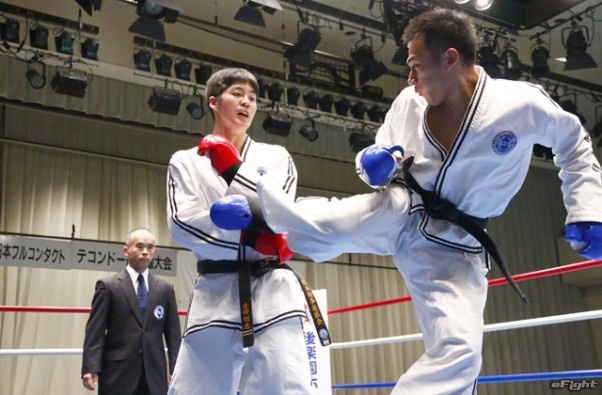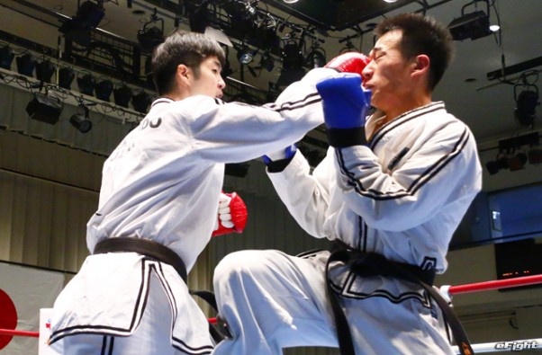長身の倉田(左)に対し、後ろ回し蹴りを放つ八幡(右)