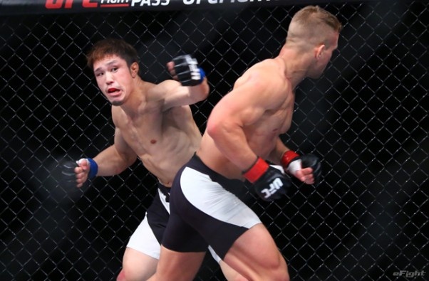 UFC初戦ではニック・ハイン(左)を相手に、優勢に試合を進めながらも、粕谷(右)は判定で敗れた