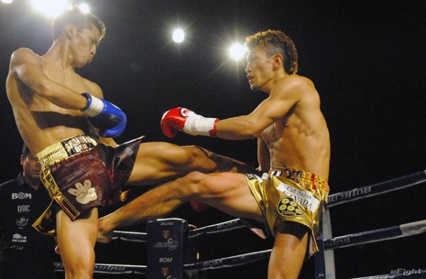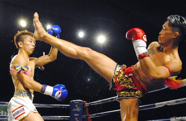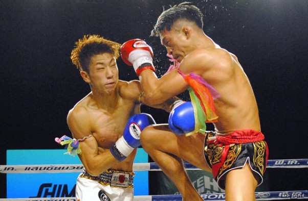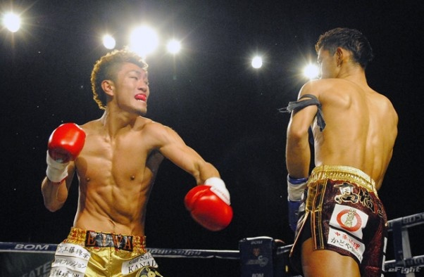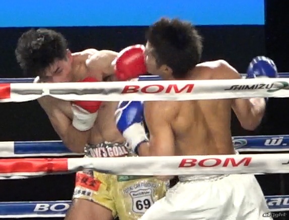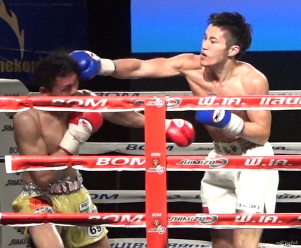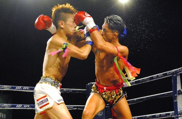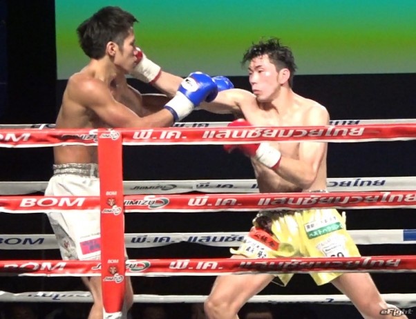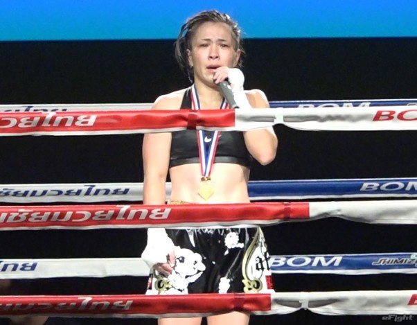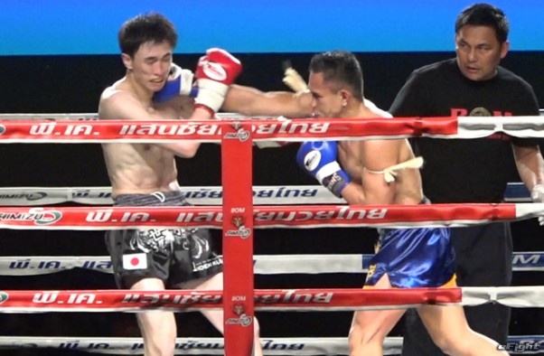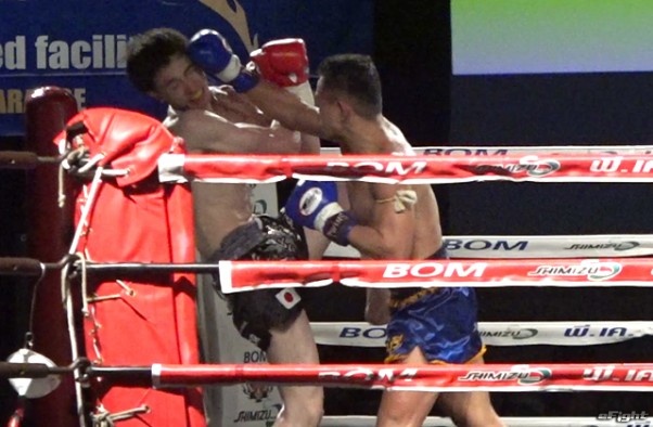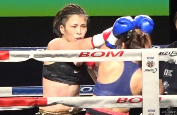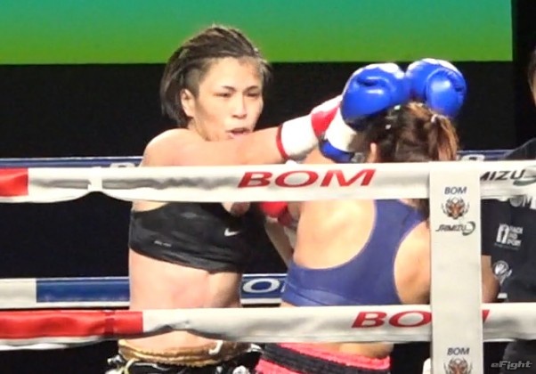 ロープを背にした久世(左)にミドルを叩き込むマキ(右)