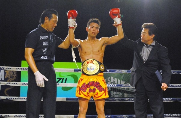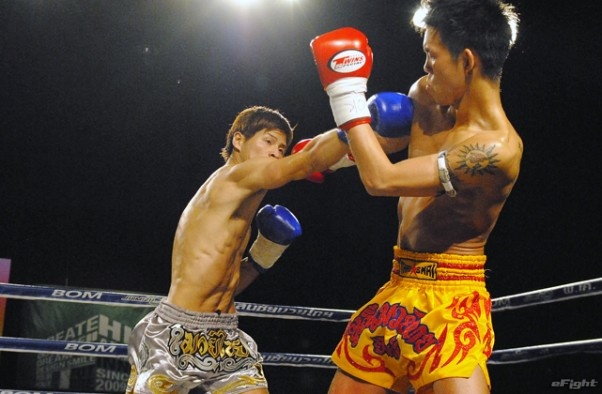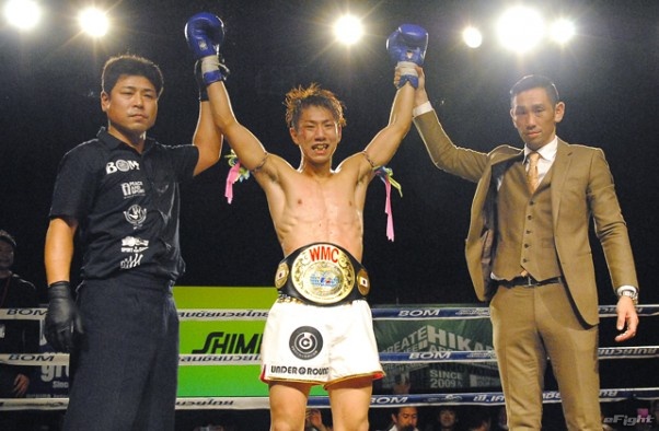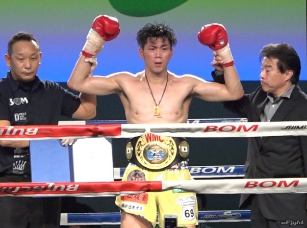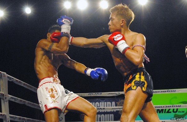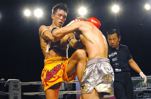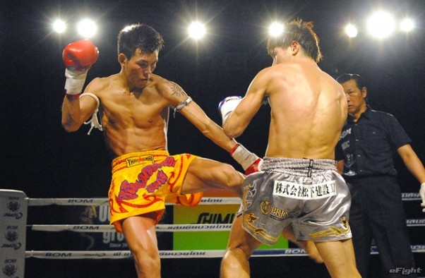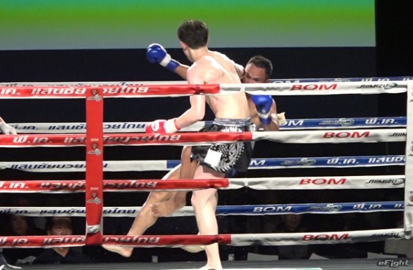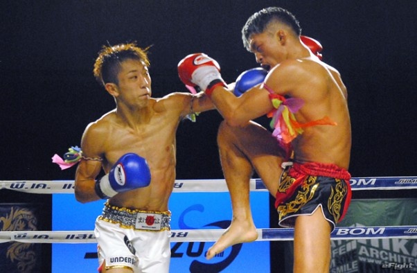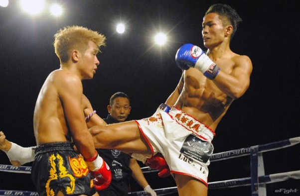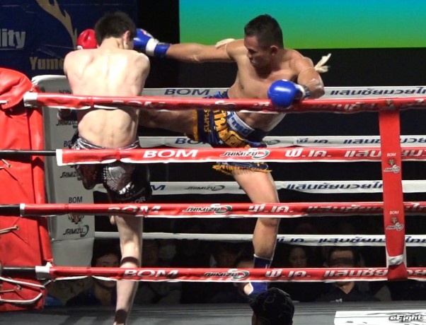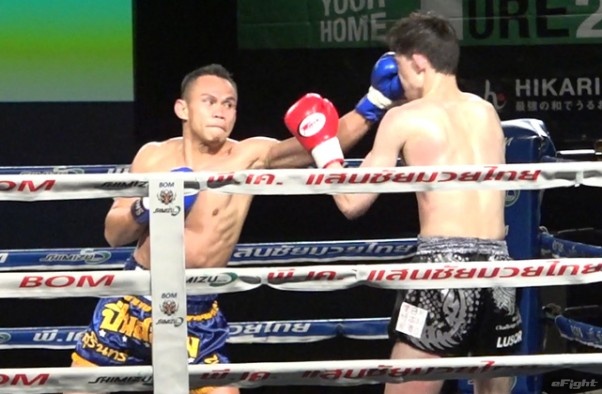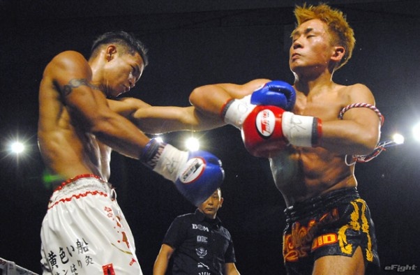 ロープを背にした久世(左)にミドルを叩き込むマキ(右)