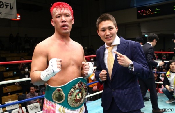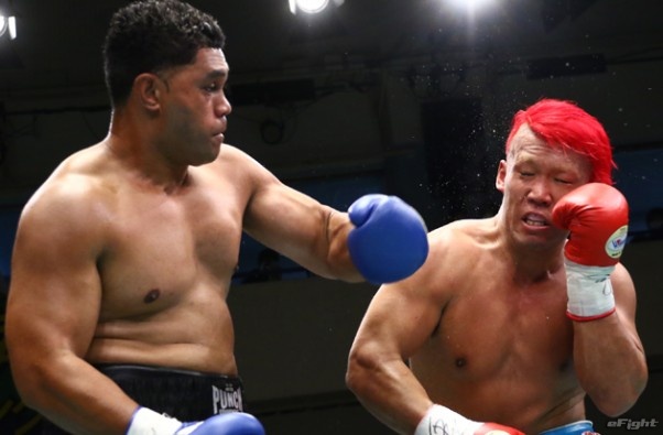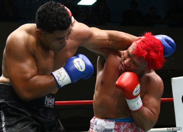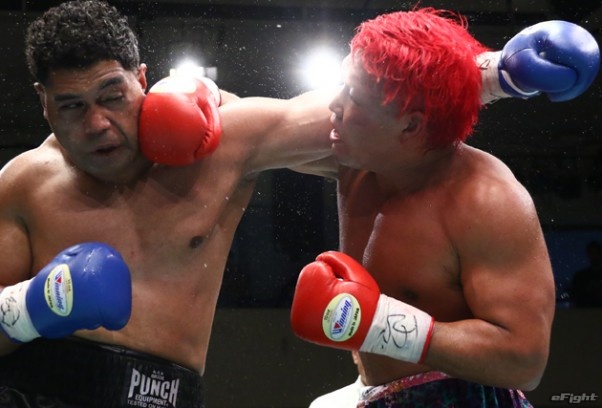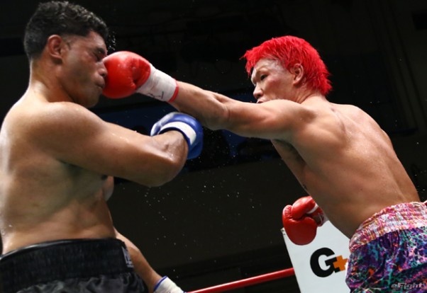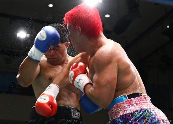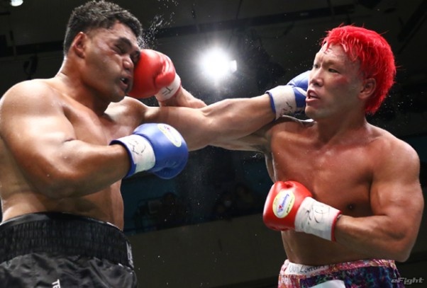 右フックでナッシオ(左)からダウンを奪った藤本(右)