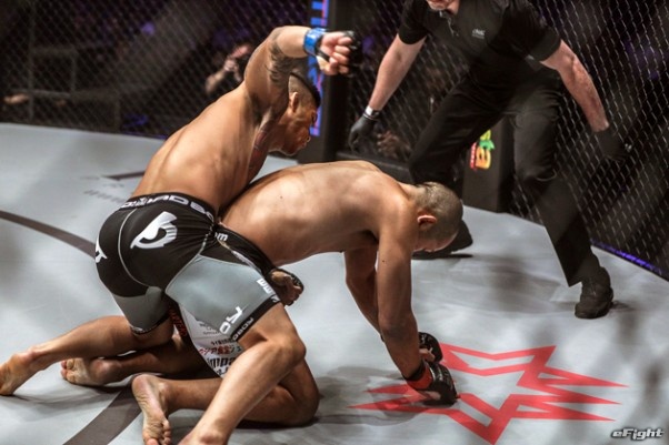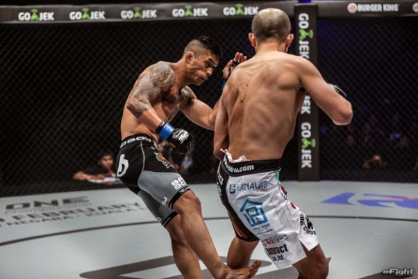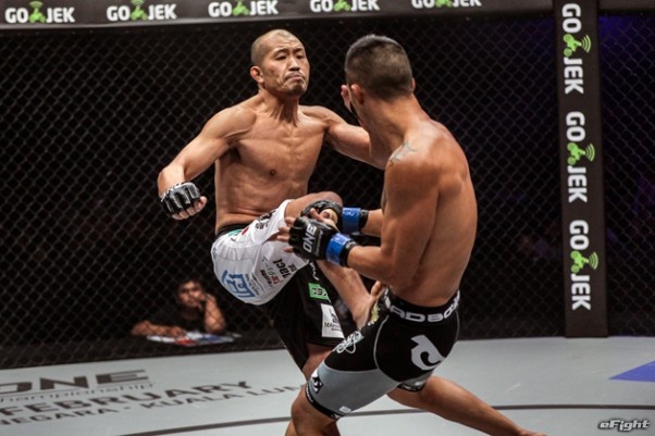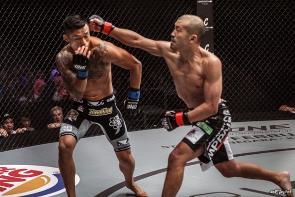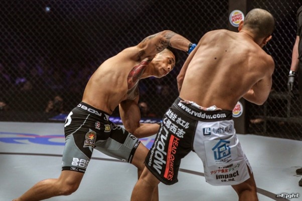 横田(右)に強烈なカウンターの右フックを見舞うヌグエン(左)
