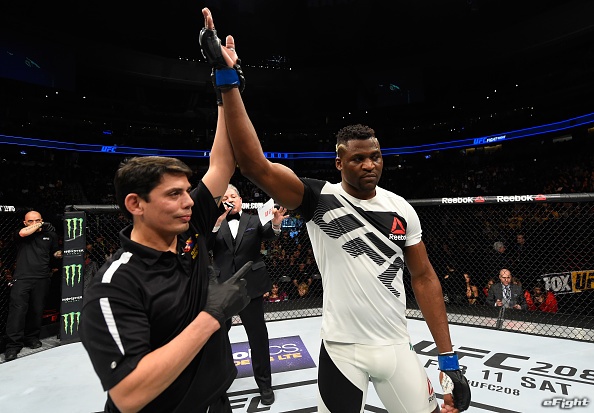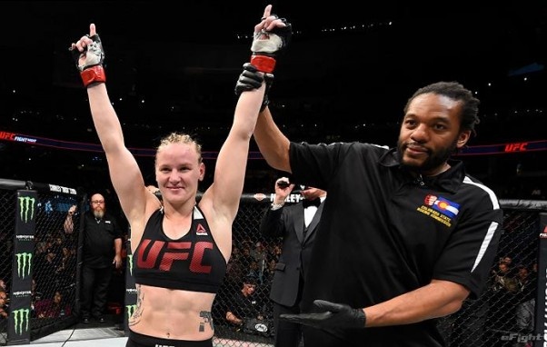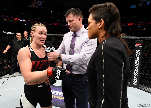 DENVER, CO - JANUARY 28: (L-R) Valentina Shevchenko of Kyrgyzstan and UFC women's bantamweight champion Amanda Nunes speak to Brian Stan during the UFC Fight Night event at the Pepsi Center on January 28, 2017 in Denver, Colorado. (Photo by Josh Hedges/Zuffa LLC/Zuffa LLC via Getty Images)
