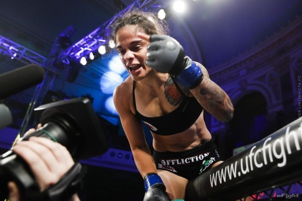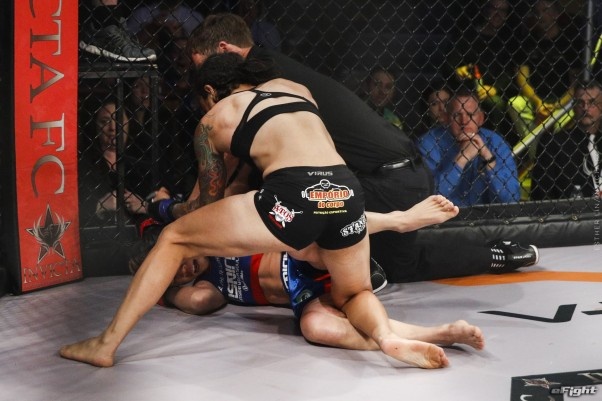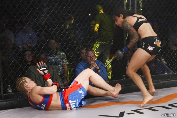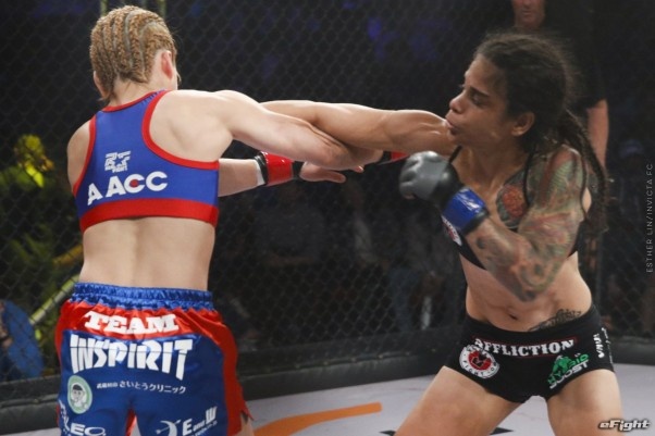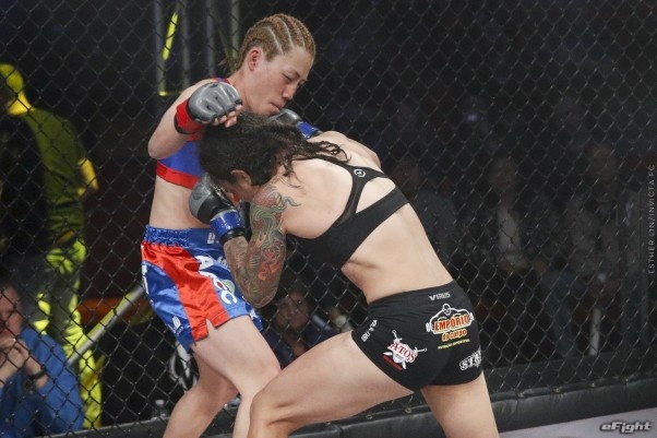 浜崎(左)をケージ際に追い込み、右フックを浴びせるソウザ(右)