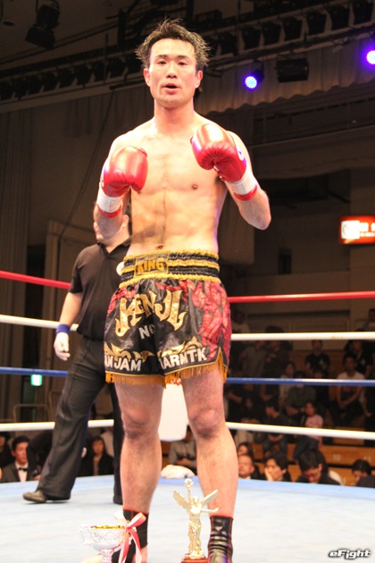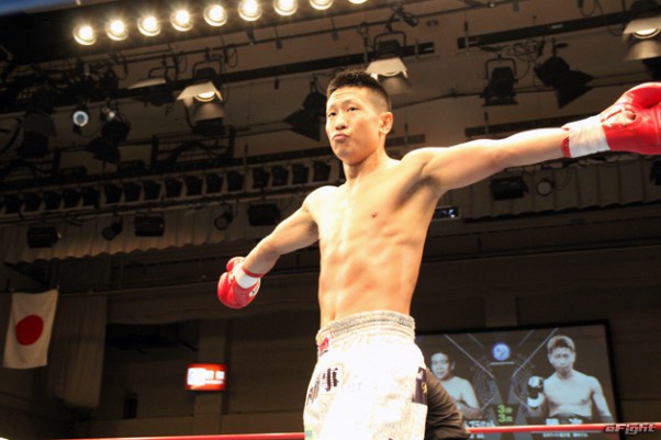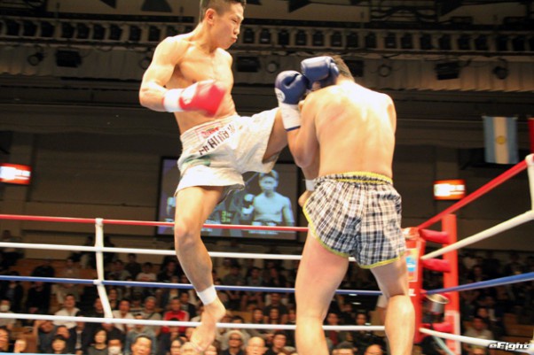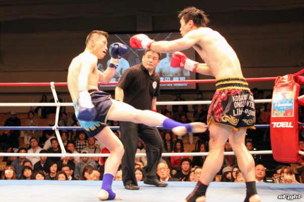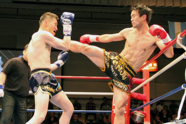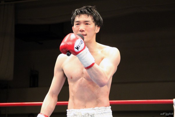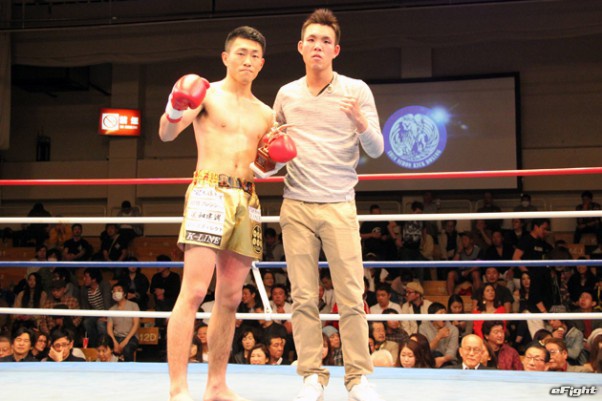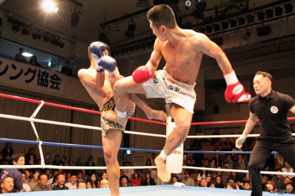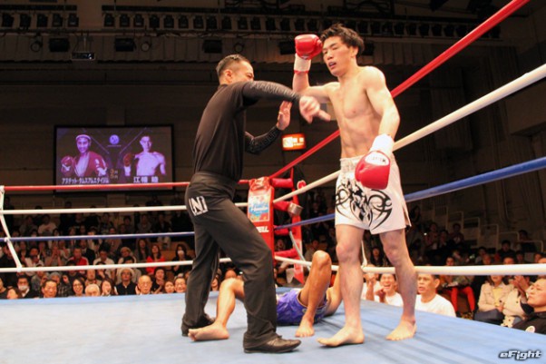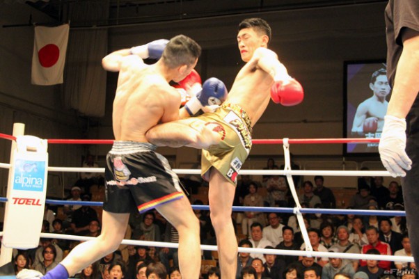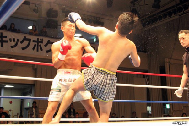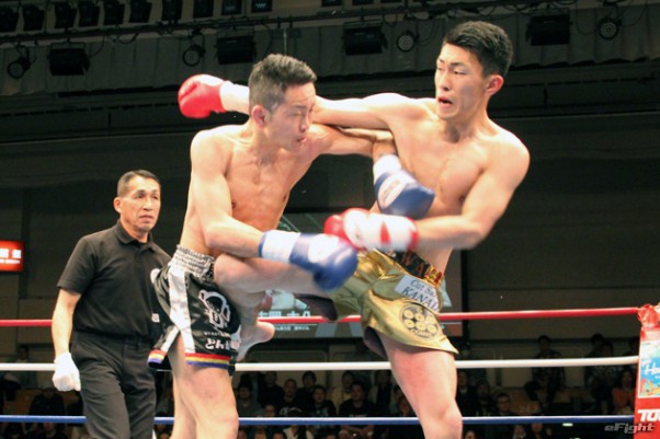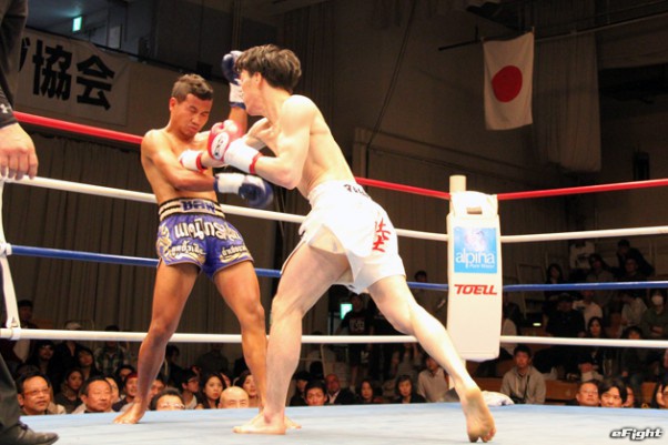 パンチでアヌチット(右)に畳み掛ける江幡(左)